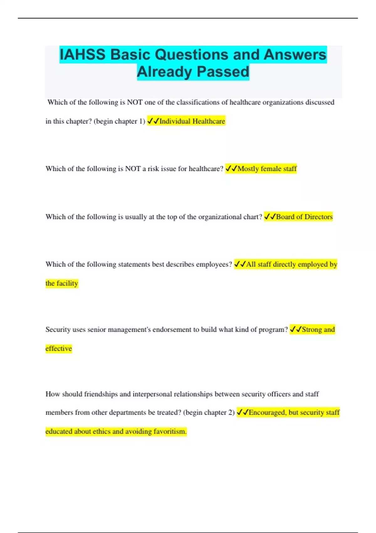 Which of the following is NOT one of the classifications of healthcare organizations discussed in this chapter? (begin chapter 1) Individual Healthcare Which of the following is NOT a risk issue for healthcare? Mostly female staff Which of the following is usually at the top of the organizational chart? Board of Directors Which of the following statements best describes employees? All staff directly employed by the facility Security uses senior management's endorsement to build what kind of program? Strong and effective How should friendships and interpersonal relationships between security officers and staff members from other departments be treated? (begin chapter 2) Encouraged, but security staff educated about ethics and avoiding favoritism.