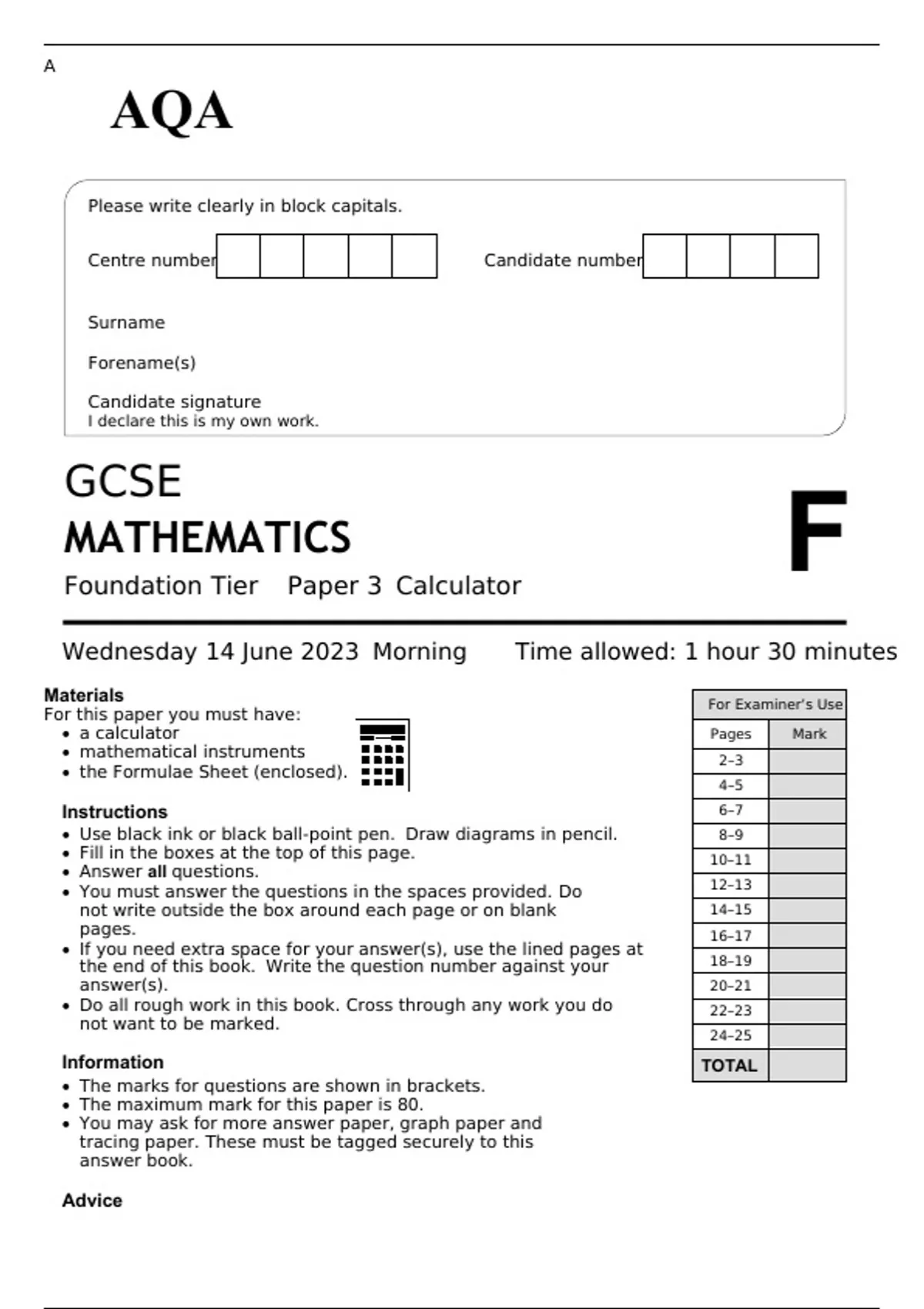AQA GCSE MATHEMATICS Foundation Tier Paper 3 JUNE 2023 QUESTION PAPER: Calculator