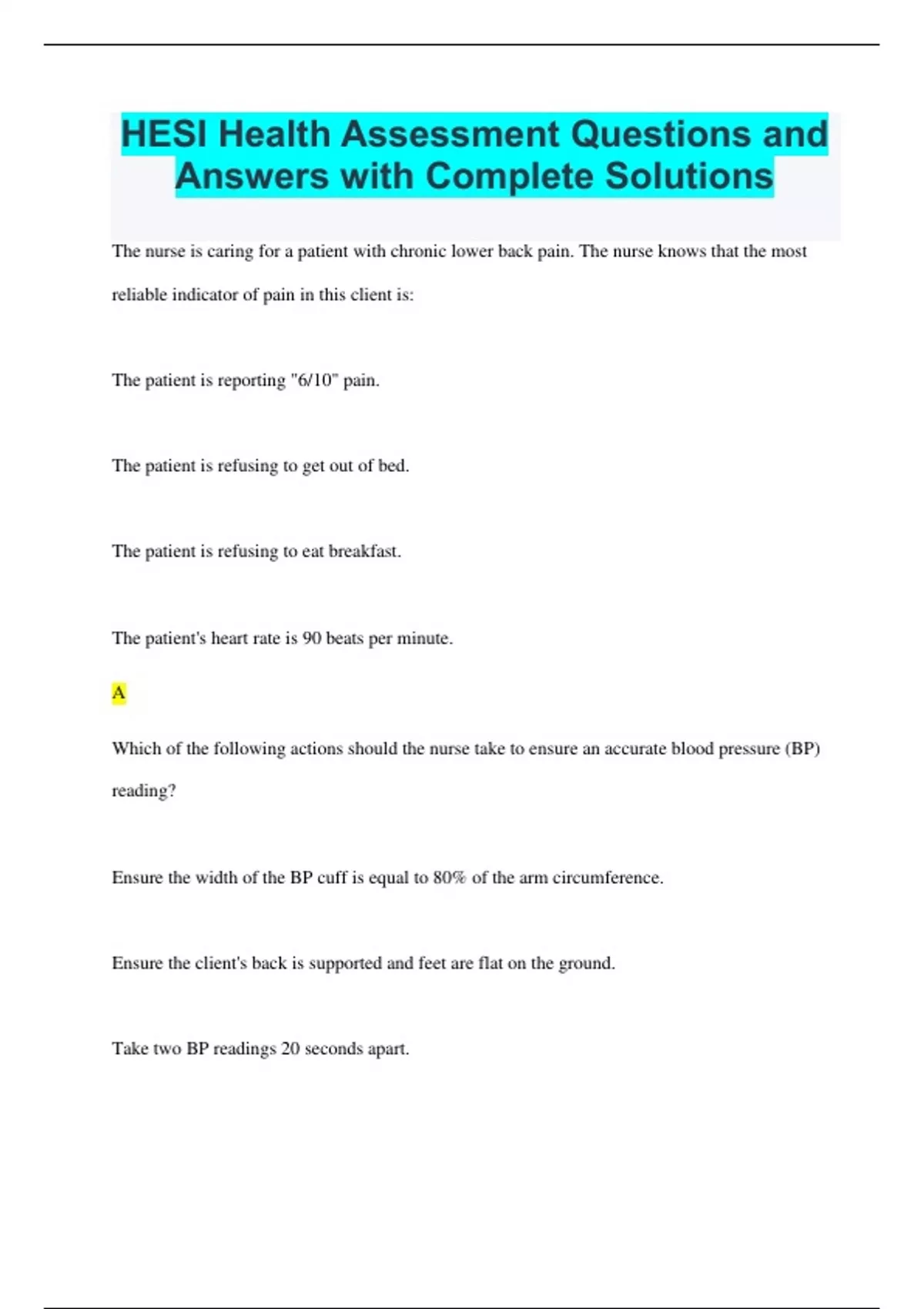 The nurse is caring for a patient with chronic lower back pain. The nurse knows that the most reliable indicator of pain in this client is: The patient is reporting "6/10" pain. The patient is refusing to get out of bed. The patient is refusing to eat breakfast. The patient's heart rate is 90 beats per minute. A Which of the following actions should the nurse take to ensure an accurate blood pressure (BP) reading? Ensure the width of the BP cuff is equal to 80% of the arm circumference. Ensure the client's back is supported and feet are flat on the ground. Take two BP readings 20 seconds apart.