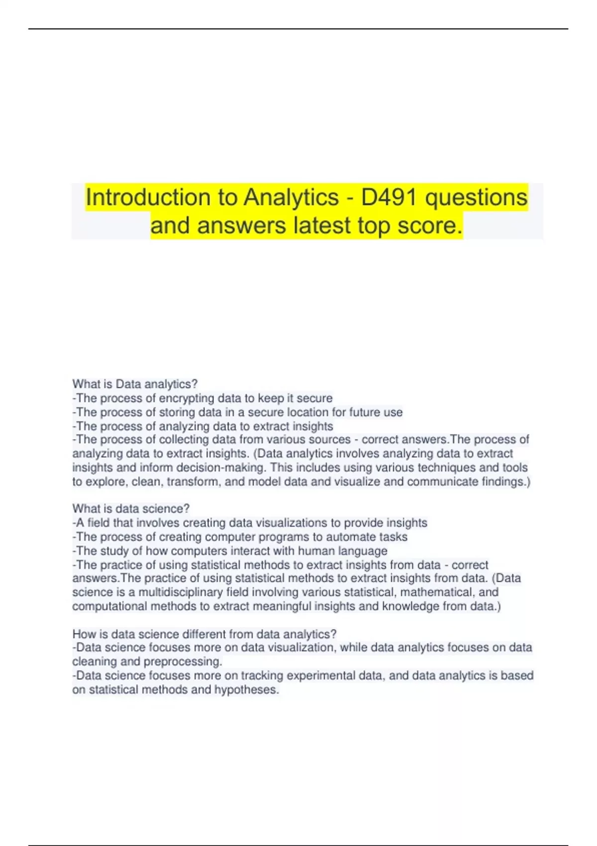 Introduction to Analytics - D491 questions and answers latest top score. What is Data analytics? -The process of encrypting data to keep it secure -The process of storing data in a secure location for future use -The process of analyzing data to extract insights -The process of collecting data from various sources - correct answers.The process of analyzing data to extract insights. (Data analytics involves analyzing data to extract insights and inform decision-making. This includes using various techniques and tools to explore, clean, transform, and model data and visualize and communicate findings.) What is data science? -A field that involves creating data visualizations to provide insights -The process of creating computer programs to automate tasks -The study of how computers interact with human language -The practice of using statistical methods to extract insights from data - correct answers.The practice of using statistical methods to extract insights from data. (Data science is a multidisciplinary field involving various statistical, mathematical, and computational methods to extract meaningful insights and knowledge from data.) How is data science different from data analytics? -Data science focuses more on data visualization, while data analytics focuses on data cleaning and preprocessing. -Data science focuses more on tracking experimental data, and data analytics is based on statistical methods and hypotheses. -Data science involves creating new algorithms, while data analytics uses existing statistical methods. -Data science focuses on developing new algorithms and models, while data analytics focuses on using existing models to analyze data. - correct answers.Data science focuses on developing new algorithms and models, while data analytics focuses on using existing models to analyze data. (Data science is more research-based, while data analytics is more focused on the practical applications of data analytics.) Which comparison describes the difference between data analytics and data science? -Data analytics focuses on statistics, and data science mainly focuses on qualitative reasoning. -Data science involves analyzing data from structured sources, while data analytics involves analyzing data from unstructured sources. -Data analytics is the process of analyzing data to extract insights, while data science involves building and testing models to make predictions. -Data analytics focuses on descriptive analysis, while data science focuses on prescriptive analysis. - correct answers.Data analytics is the process of analyzing data to extract insights, while data science involves building and testing models to make predictions. (Data analytics involves using statistical and quantitative methods to analyze data to extract insights and solve problems, while data science involves using machine learning and statistical models to build predictive models and make decisions based on data.) Which type of data analytics project aims to determine why something happened in the past? -Prescriptive -Descriptive -Predictive -Diagnostic - correct answers.Descriptive (Descriptive analytics focuses on summarizing past events and understanding what happened.) What are the different types of data analytics projects? -Regression analysis, time series analysis, text analytics, and network analysis -Data warehousing, data mining, data visualization, and business intelligence -Descriptive, diagnostic, predictive, and prescriptive analytics -Data collection, data cleaning, data transformation, and data visualization - correct answers.Descriptive, diagnostic, predictive, and prescriptive analytics What is the difference between exploratory and confirmatory data analytics projects? -Exploratory projects involve testing hypotheses and finding patterns in data, while confirmatory projects involve verifying existing hypotheses. -Exploratory projects involve analyzing data from a single source, while confirmatory projects involve integrating data from multiple sources. -Exploratory projects involve analyzing data that is already structured, while confirmatory projects involve analyzing unstructured data.