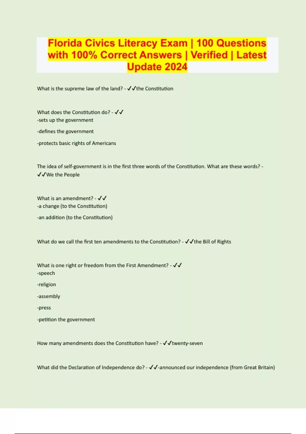 Florida Civics Literacy Exam | 100 Questions with 100% Correct Answers | Verified | Latest Update 2024