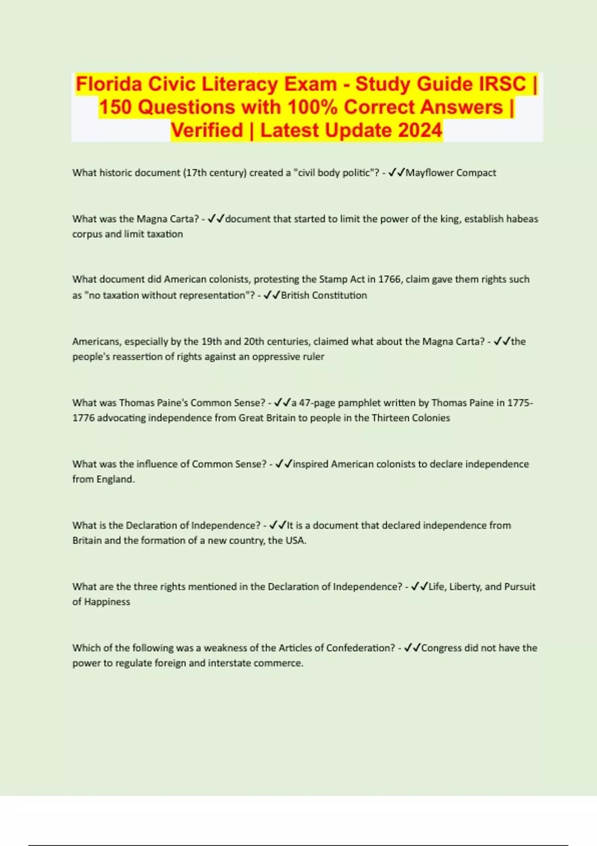 Florida Civic Literacy Exam - Study Guide IRSC | 150 Questions with 100% Correct Answers | Verified | Latest Update 2024