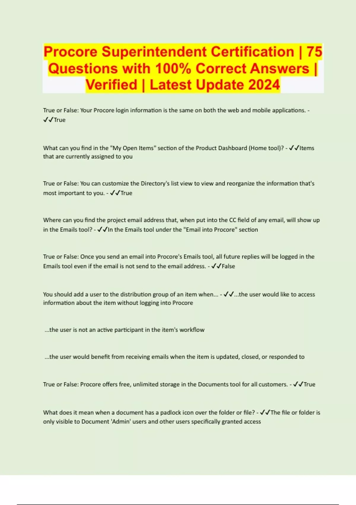 Procore Superintendent Certification | 75 Questions with 100% Correct Answers | Verified | Latest Update 2024