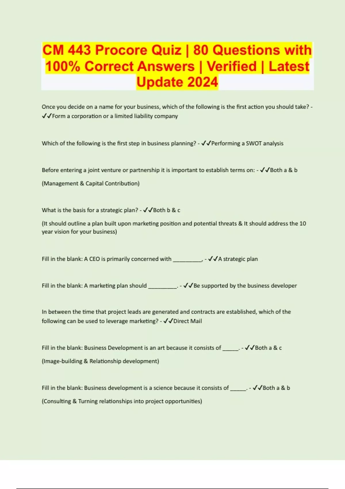 Once you decide on a name for your business, which of the following is the first action you should take? - Form a corporation or a limited liability company Which of the following is the first step in business planning? - Performing a SWOT analysis Before entering a joint venture or partnership it is important to establish terms on: - Both a & b (Management & Capital Contribution) What is the basis for a strategic plan? - Both b & c (It should outline a plan built upon marketing position and potential threats & It should address the 10 year vision for your business) Fill in the blank: A CEO is primarily concerned with _________, - A strategic plan Fill in the blank: A marketing plan should _________. - Be supported by the business developer In between the time that project leads are generated and contracts are established, which of the following can be used to leverage marketing? - Direct Mail