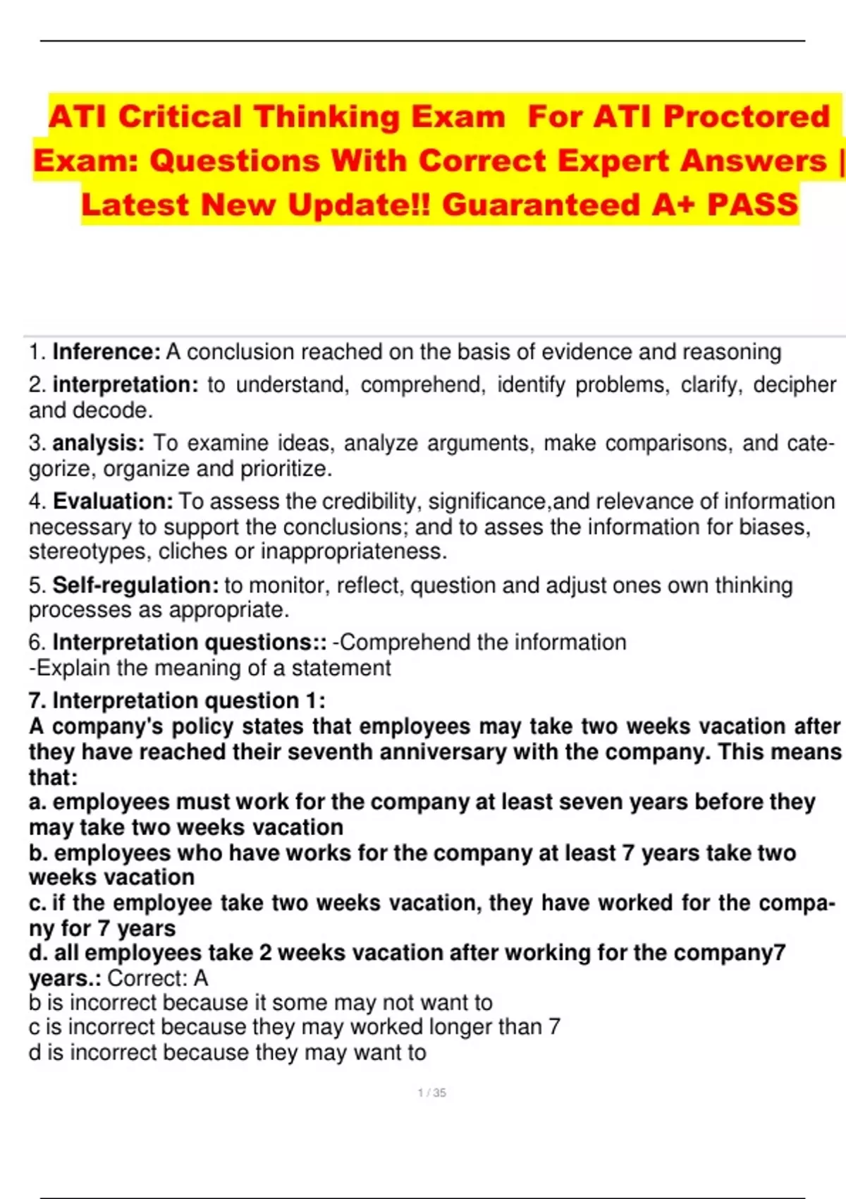 ATI Critical Thinking Exam For ATI Proctored Exam: Questions With Correct Expert Answers | Latest New Update!! Guaranteed A+ PASS 1. Inference: A conclusion reached on the basis of evidence and reasoning 2. interpretation: to understand, comprehend, identify problems, clarify, decipher and decode. 3. analysis: To examine ideas, analyze arguments, make comparisons, and categorize, organize and prioritize. 4. Evaluation: To assess the credibility, significance,and relevance of information necessary to support the conclusions; and to asses the information for biases, stereotypes, cliches or inappropriateness. 5. Self-regulation: to monitor, reflect, question and adjust ones own thinking processes as appropriate. 6. Interpretation questions:: -Comprehend the information -Explain the meaning of a statement 7. Interpretation question 1: A company's policy states that employees may take two weeks vacation after they have reached their seventh anniversary with the company. This means that: a. employees must work for the company at least seven years before they may take two weeks vacation b. employees who have works for the company at least 7 years take two weeks vacation c. if the employee take two weeks vacation, they have worked for the company for 7 years d. all employees take 2 weeks vacation after working for the company7 years.: Correct: A b is incorrect because it some may not want to c is incorrect because they may worked longer than 7 d is incorrect because they may want to