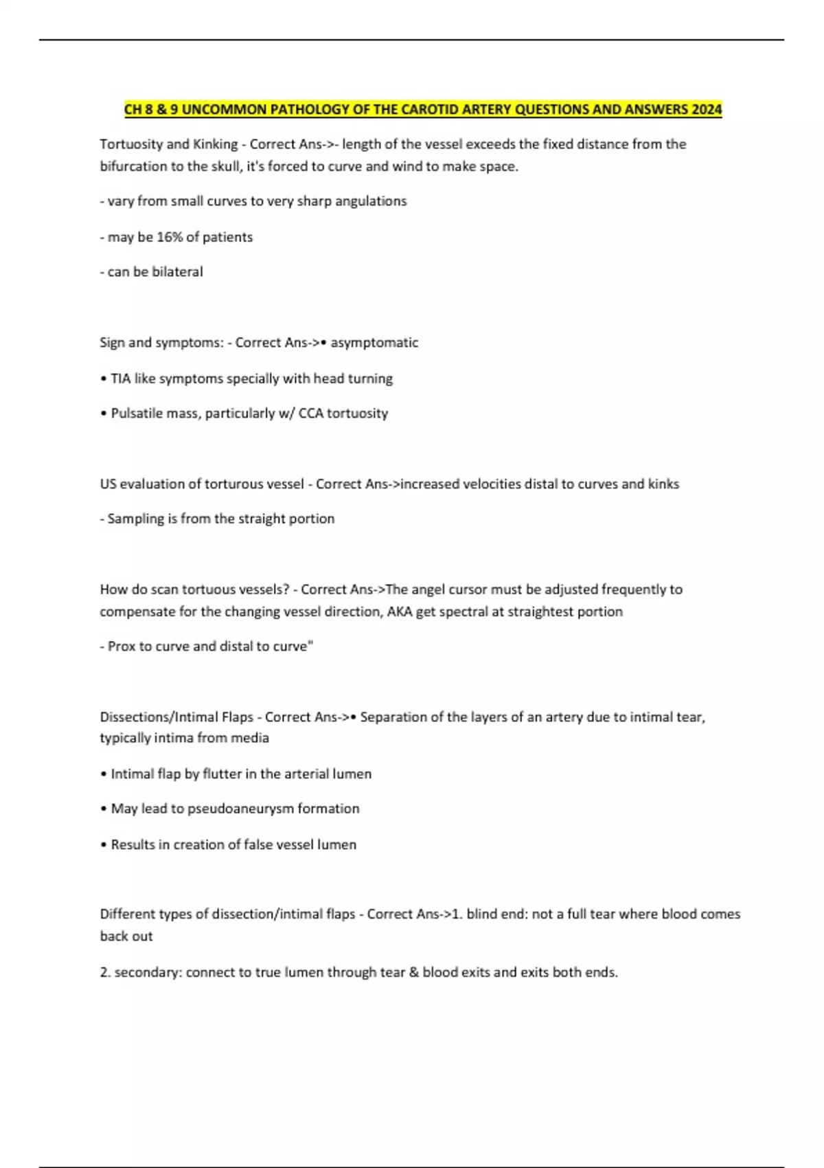 CH 8 & 9 UNCOMMON PATHOLOGY OF THE CAROTID ARTERY QUESTIONS AND ANSWERS 2024 Tortuosity and Kinking - Correct Ans->- length of the vessel exceeds the fixed distance from the bifurcation to the skull, it's forced to curve and wind to make space. - vary from small curves to very sharp angulations - may be 16% of patients - can be bilateral Sign and symptoms: - Correct Ans->• asymptomatic • TIA like symptoms specially with head turning • Pulsatile mass, particularly w/ CCA tortuosity US evaluation of torturous vessel - Correct Ans->increased velocities distal to curves and kinks - Sampling is from the straight portion How do scan tortuous vessels? - Correct Ans->The angel cursor must be adjusted frequently to compensate for the changing vessel direction, AKA get spectral at straightest portion - Prox to curve and distal to curve" Dissections/Intimal Flaps - Correct Ans->• Separation of the layers of an artery due to intimal tear, typically intima from media • Intimal flap by flutter in the arterial lumen • May lead to pseudoaneurysm formation • Results in creation of false vessel lumen Different types of dissection/intimal flaps - Correct Ans->1. blind end: not a full tear where blood comes back out 2. secondary: connect to true lumen through tear & blood exits and exits both ends. causes of dissection/intimal flaps - Correct Ans->• Trauma • Hypertension • Following carotid endarterectomy • May be associated with other diseases(FMD, Marfan syndrome, Ehler-Danlos syndrome) • Extension into the CCA from an aortic dissection Sign and symptoms of dissection/intimal flaps - Correct Ans->• Asymptomatic• Unilateral head, face, or neck pain (usually associated with ICA dissection) • Hemispheric stroke or TIA symptoms • Dissection should be suspected in young patients who present with stroke symptoms. where to place cursor when doing doppler for Tortuous vessels? - Correct Ans->SETTING THE MIDDLE OF THE ANGLE CORRECT CURSOR PARALLEL TOTHE VESSEL WALL, whether it be straight or tortuous False Lumen flow patterns when there is a dissection - Correct Ans->- High resistance flow pattern - Blood flow into and out of the false lumen in a to-and-fro pattern - No flow as thrombus may form - Reversed flow direction Where dissections most commonly occur? - Correct Ans->Most dissections occur in the thoracic aorta Dissections - who is most commonly affected and what would their symptoms be? - Correct Ans- >DISSECTION SHOULD BE SUSPECTED WHEN YOUNG PEOPLE BETWEEN 35 & 50 PRESENT WITH STROKE SYMPTOMS, WITH NO RISK FACTORS FOR ATHEROSCLEROSIS, PARTICULARLY IF THERE IS A HISTORY OF TRAUMA