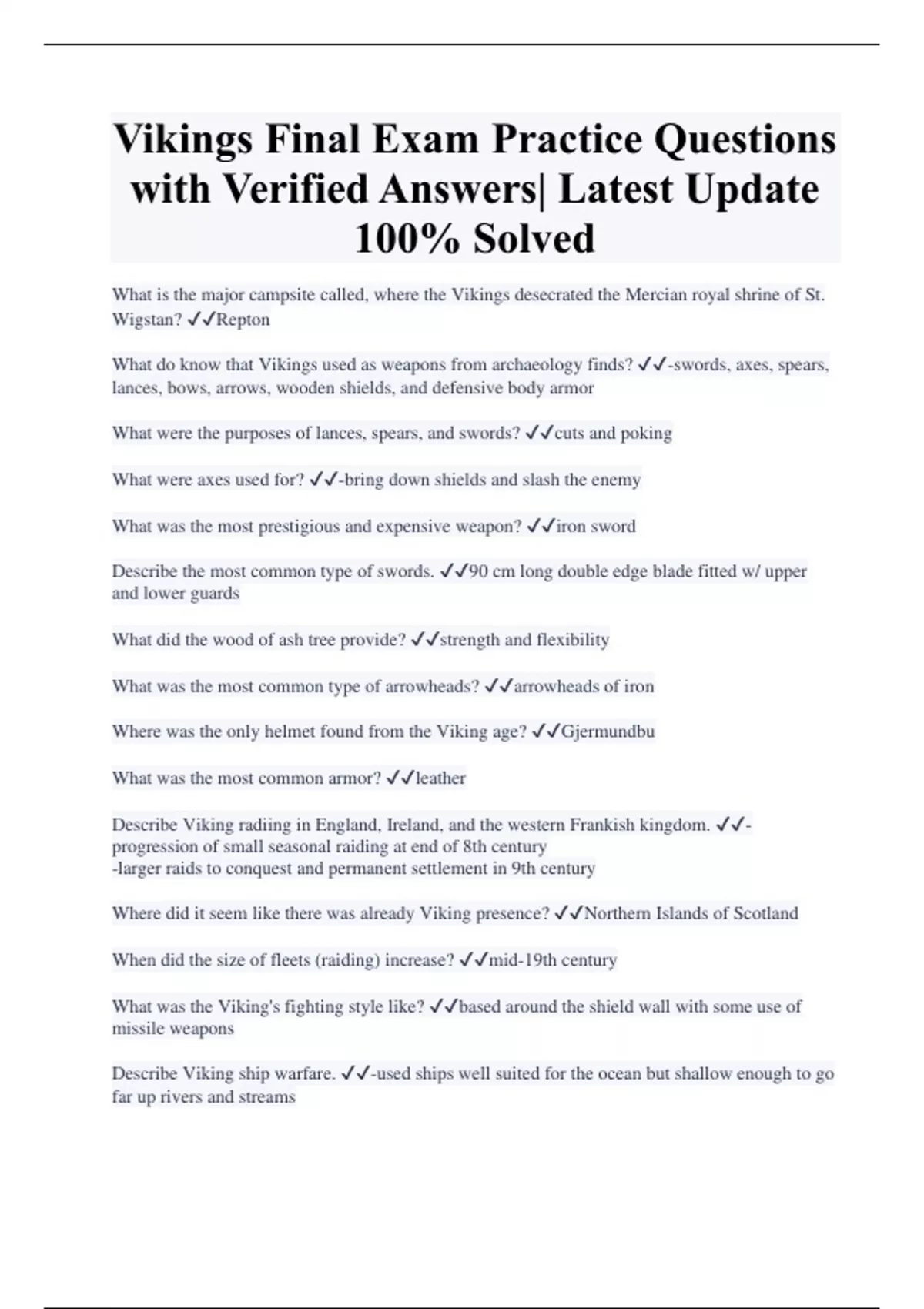 Vikings Final Exam Practice Questions with Verified Answers| Latest Update 100% Solved What is the major campsite called, where the Vikings desecrated the Mercian royal shrine of St. Wigstan? Repton What do know that Vikings used as weapons from archaeology finds? -swords, axes, spears, lances, bows, arrows, wooden shields, and defensive body armor What were the purposes of lances, spears, and swords? cuts and poking What were axes used for? -bring down shields and slash the enemy What was the most prestigious and expensive weapon? iron sword Describe the most common type of swords. 90 cm long double edge blade fitted w/ upper and lower guards What did the wood of ash tree provide? strength and flexibility What was the most common type of arrowheads? arrowheads of iron Where was the only helmet found from the Viking age? Gjermundbu What was the most common armor? leather
