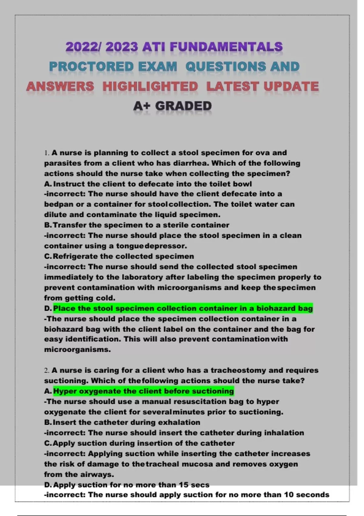 ATI FUNDAMENTALS PROCTORED EXAM 1. A nurse is planning to collect a stool specimen for ova and parasites from a client who has diarrhea. Which of the following actions should the nurse take when collecting the specimen? A. Instruct the client to defecate into the toilet bowl -incorrect: The nurse should have the client defecate into a bedpan or a container for stool collection. The toilet water can dilute and contaminate the liquid specimen. B. Transfer the specimen to a sterile container -incorrect: The nurse should place the stool specimen in a clean container using a tongue depressor. C. Refrigerate the collected specimen -incorrect: The nurse should send the collected stool specimen immediately to the laboratory after labeling the specimen properly to prevent contamination with microorganisms and keep the specimen from getting cold. D. Place the stool specimen collection container in a biohazard bag -The nurse should place the specimen collection container in a biohazard bag with the client label on the container and the bag for easy identification. This will also prevent contamination with microorganisms.