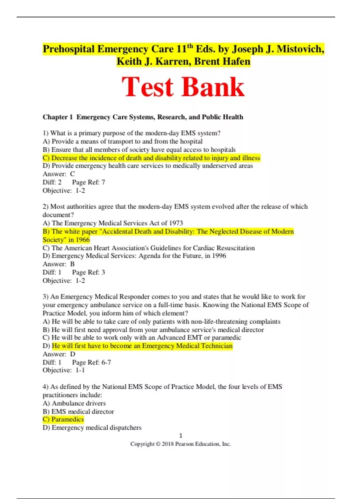 Prehospital Emergency Care, 11e (Mistovich et al.) Chapter 1 Emergency Care Systems, Research, and Public Health 1) What is a primary purpose of the modern-day EMS system? A) Provide a means of transport to and from the hospital B) Ensure that all members of society have equal access to hospitals C) Decrease the incidence of death and disability related to injury and illness D) Provide emergency health care services to medically underserved areas Answer: C Diff: 2 Page Ref: 7 Objective: 1-2 2) Most authorities agree that the modern-day EMS system evolved after the release of which document? A) The Emergency Medical Services Act of 1973 B) The white paper