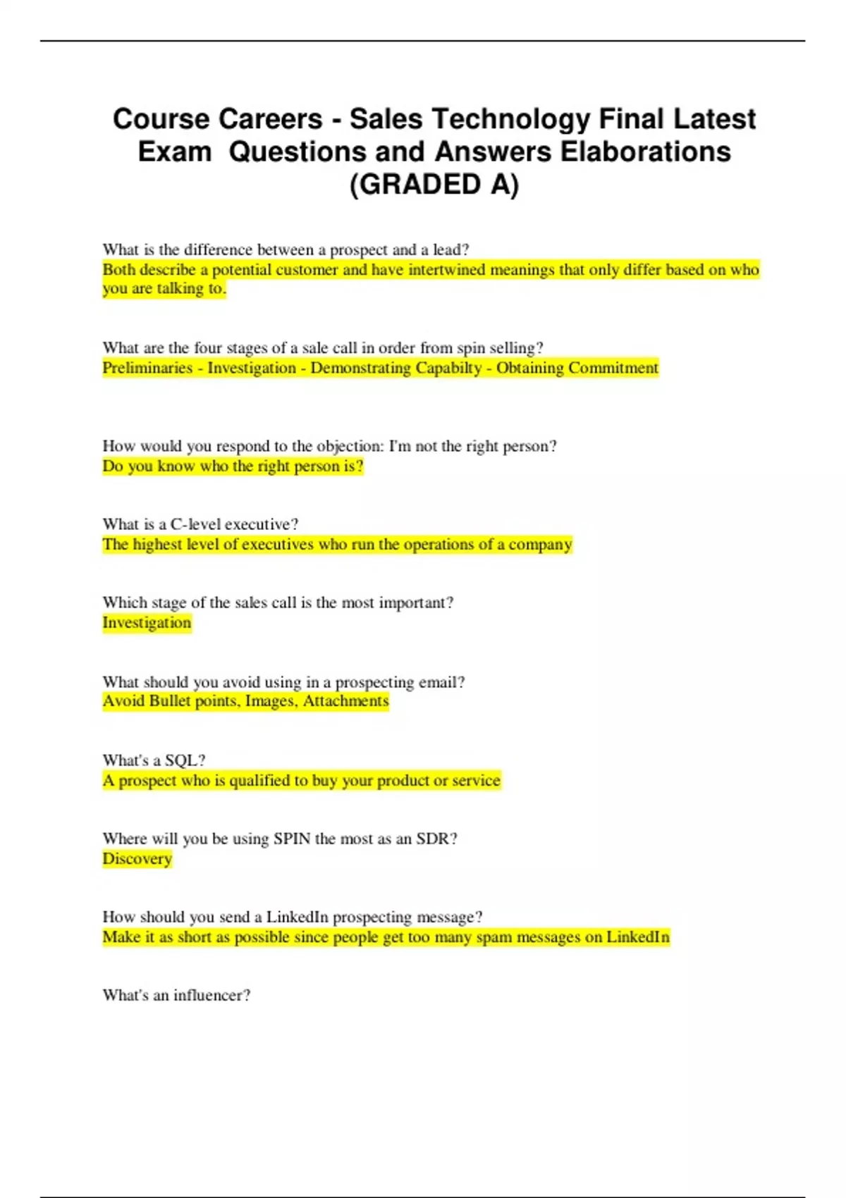 Course Careers .Course Careers - Sales Technology Final Exams (Latest 2024 Updates STUDY PACKAGE DEAL WITH COMPLETE SOLUTIONS) Questions and Verified Answers| 100% Guaranteed Pass