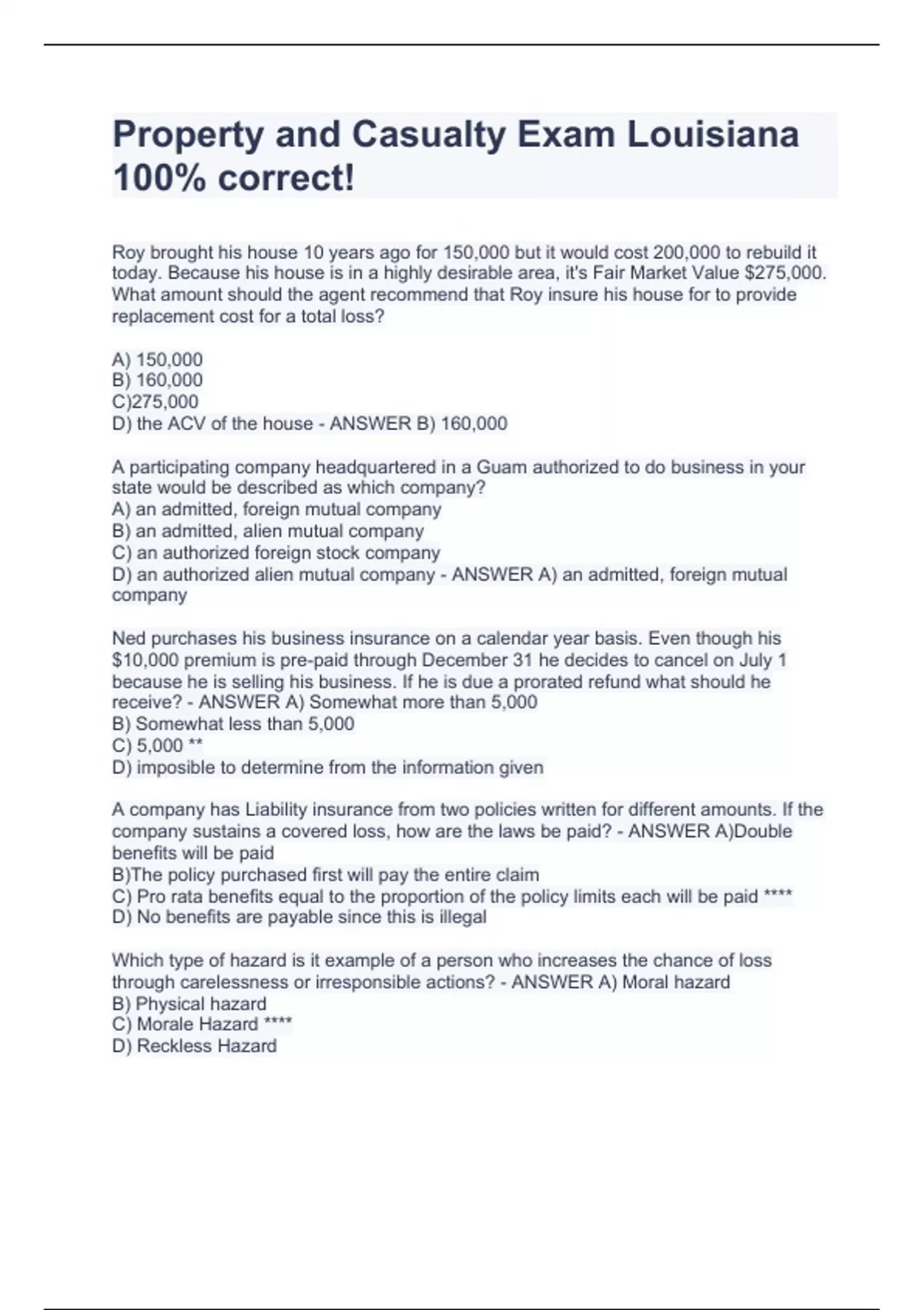 Property and Casualty Exam Louisiana Roy brought his house 10 years ago for 150,000 but it would cost 200,000 to rebuild it today. Because his house is in a highly desirable area, it's Fair Market Value $275,000. What amount should the agent recommend that Roy insure his house for to provide replacement cost for a total loss? A) 150,000 B) 160,000 C)275,000 D) the ACV of the house - ANSWER B) 160,000 A participating company headquartered in a Guam authorized to do business in your state would be described as which company? A) an admitted, foreign mutual company B) an admitted, alien mutual company C) an authorized foreign stock company D) an authorized alien mutual company - ANSWER A) an admitted, foreign mutual company Ned purchases his business insurance on a calendar year basis. Even though his $10,000 premium is pre-paid through December 31 he decides to cancel on July 1 because he is selling his business. If he is due a prorated refund what should he receive? - ANSWER A) Somewhat more than 5,000 B) Somewhat less than 5,000 C) 5,000 ** D) imposible to determine from the information given A company has Liability insurance from two policies written for different amounts. If the company sustains a covered loss, how are the laws be paid? - ANSWER A)Double benefits will be paid B)The policy purchased first will pay the entire claim C) Pro rata benefits equal to the proportion of the policy limits each will be paid **** D) No benefits are payable since this is illegal 100% correct!