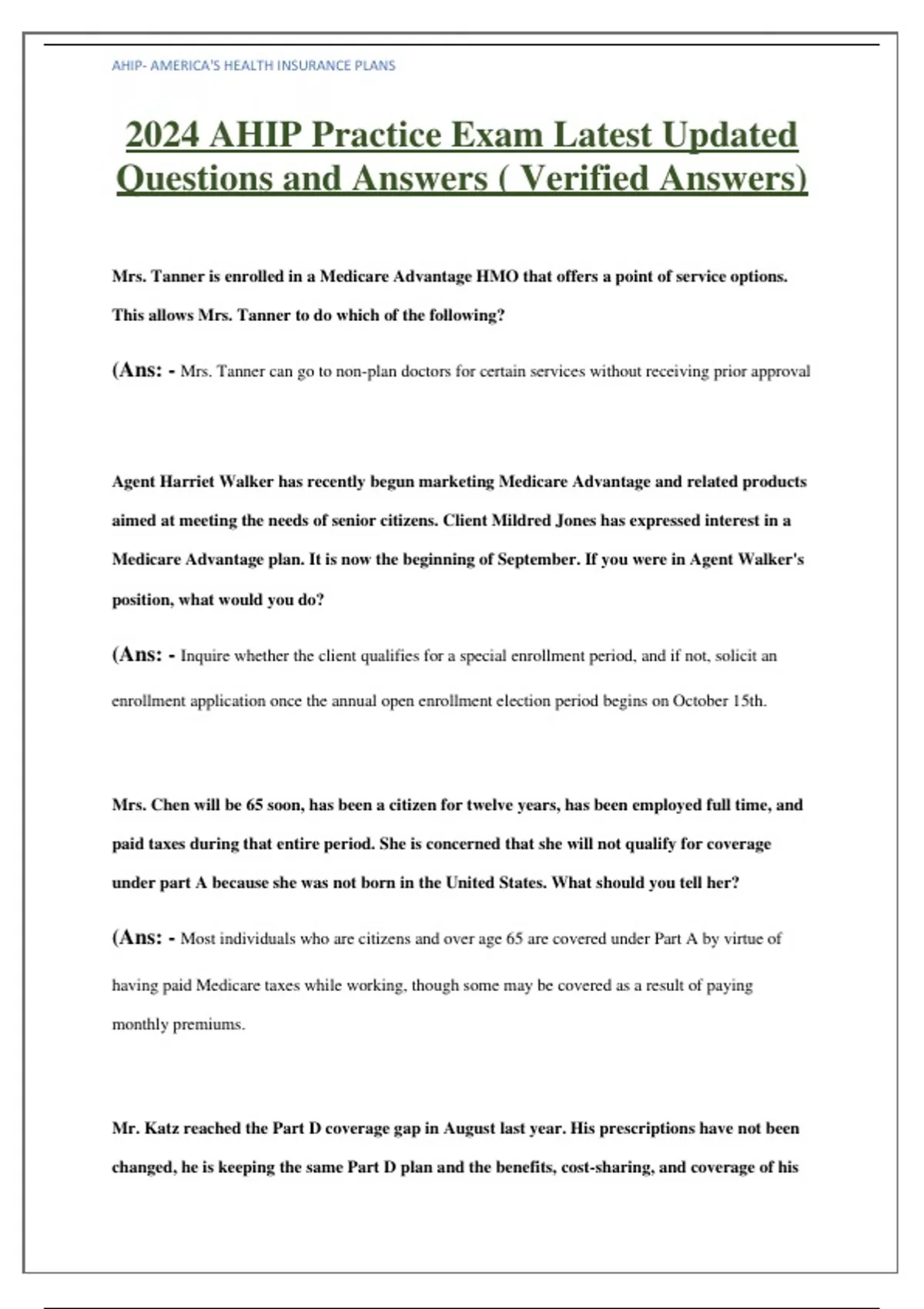 2024 AHIP Practice Exam Latest Updated Questions and Answers ( Verified Answers)