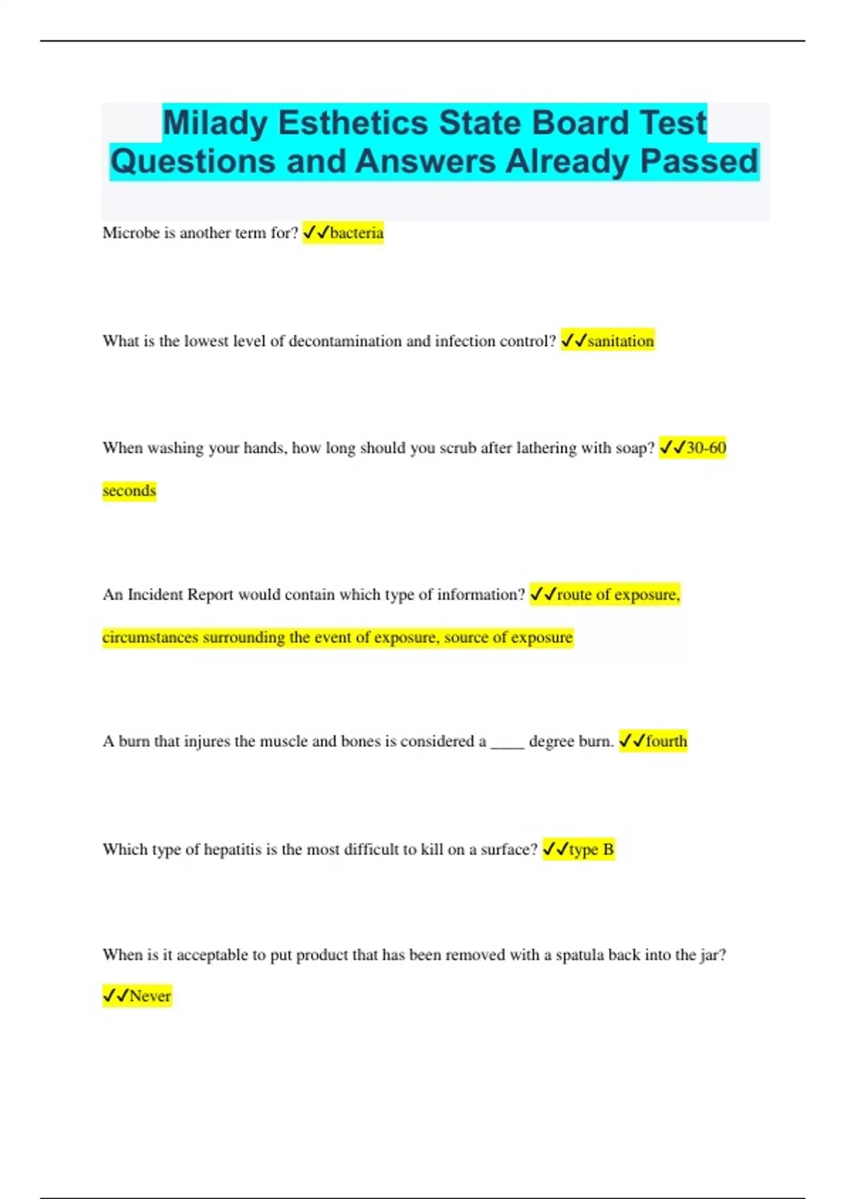 Milady Esthetics State Board Test Questions and Answers Already Passed Microbe is another term for? bacteria What is the lowest level of decontamination and infection control? sanitation When washing your hands, how long should you scrub after lathering with soap? 30-60 seconds An Incident Report would contain which type of information? route of exposure, circumstances surrounding the event of exposure, source of exposure A burn that injures the muscle and bones is considered a ____ degree burn. fourth Which type of hepatitis is the most difficult to kill on a surface? type B When is it acceptable to put product that has been removed with a spatula back into the jar? Never Bacteria multiply best in places that are? Warm Scabies is caused by? animal parasite The ______ cranial nerve is the chief motor nerve of the face. seventh The human body has how many bones? 206 The cervical nerves originate at the? spinal cord Which of these is a function of the skeletal system? provides the shape and form for the body, protects the internal organs, blood production Nonstriated muscles are also knows as what kind of muscles? involuntary, visceral, smooth How many muscles are in your face? 30 Massaging the _____ nerve affects the skin of the lower eyelid, side of the nose, upper lip, and mouth. infraoribtal What is a function of the blood? help equalize the body's temperature The average brain weighs about? 46 pounds Oxygen is? colorless, odorless & tasteless what is the lightest element known? hydrogen What has neither a definite size nor a definite shape? Gas The skin's protective barrier agains certain forms of bacteria and microorganisms is called the? acid mantle When free radicals cause an oxidation reaction they also? produce a new free radical soaps are? highly alkaline solutions are usually? transparent If a substance is hydrophilic, it is considered? water loving One advantage of O/W emulsions is that they?