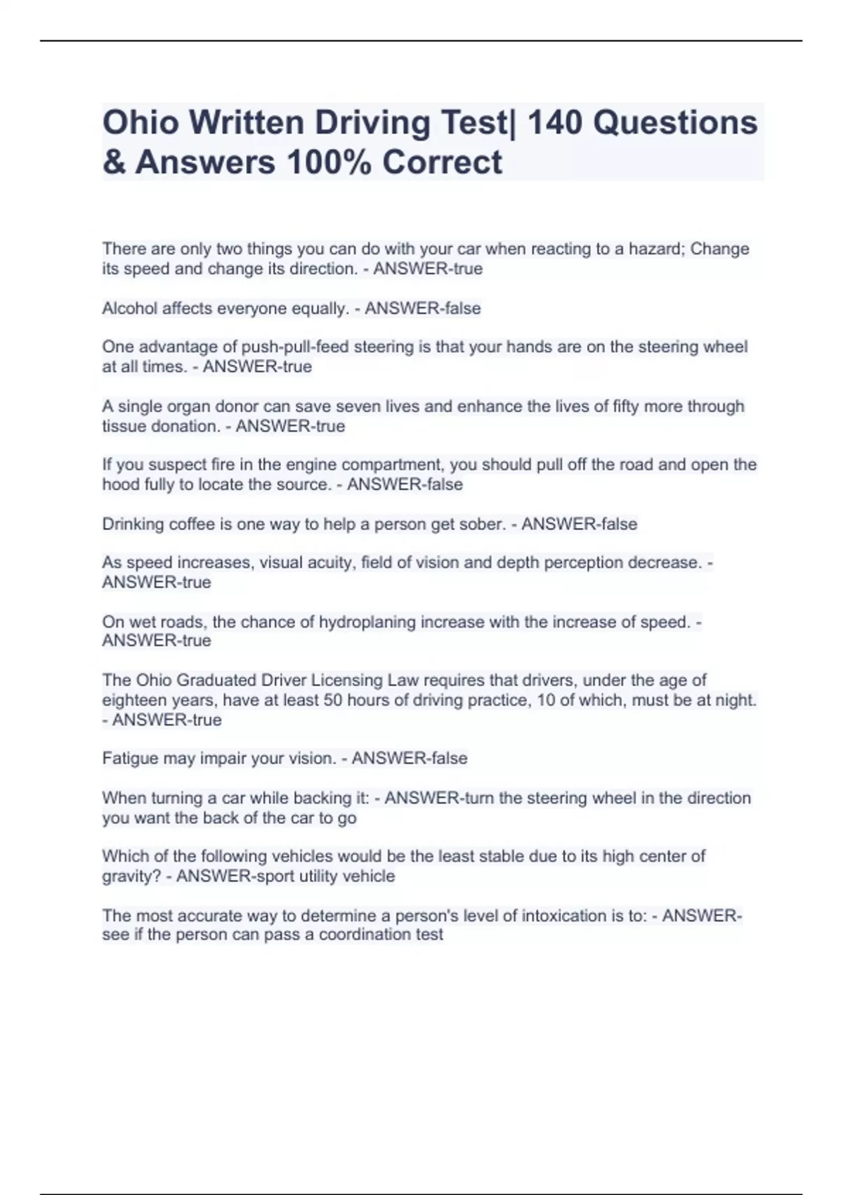 A single organ donor can save seven lives and enhance the lives of fifty more through tissue donation. - ANSWER-true If you suspect fire in the engine compartment, you should pull off the road and open the hood fully to locate the source. - ANSWER-false Drinking coffee is one way to help a person get sober. - ANSWER-false As speed increases, visual acuity, field of vision and depth perception decrease. - ANSWER-true On wet roads, the chance of hydroplaning increase with the increase of speed. - ANSWER-true The Ohio Graduated Driver Licensing Law requires that drivers, under the age of eighteen years, have at least 50 hours of driving practice, 10 of which, must be at night. - ANSWER-true Fatigue may impair your vision. - ANSWER-false When turning a car while backing it: - ANSWER-turn the steering wheel in the direction you want the back of the car to go Which of the following vehicles would be the least stable due to its high center of gravity? - ANSWER-sport utility vehicle The most accurate way to determine a person's level of intoxication is to: - ANSWER-see if the person can pass a coordination test