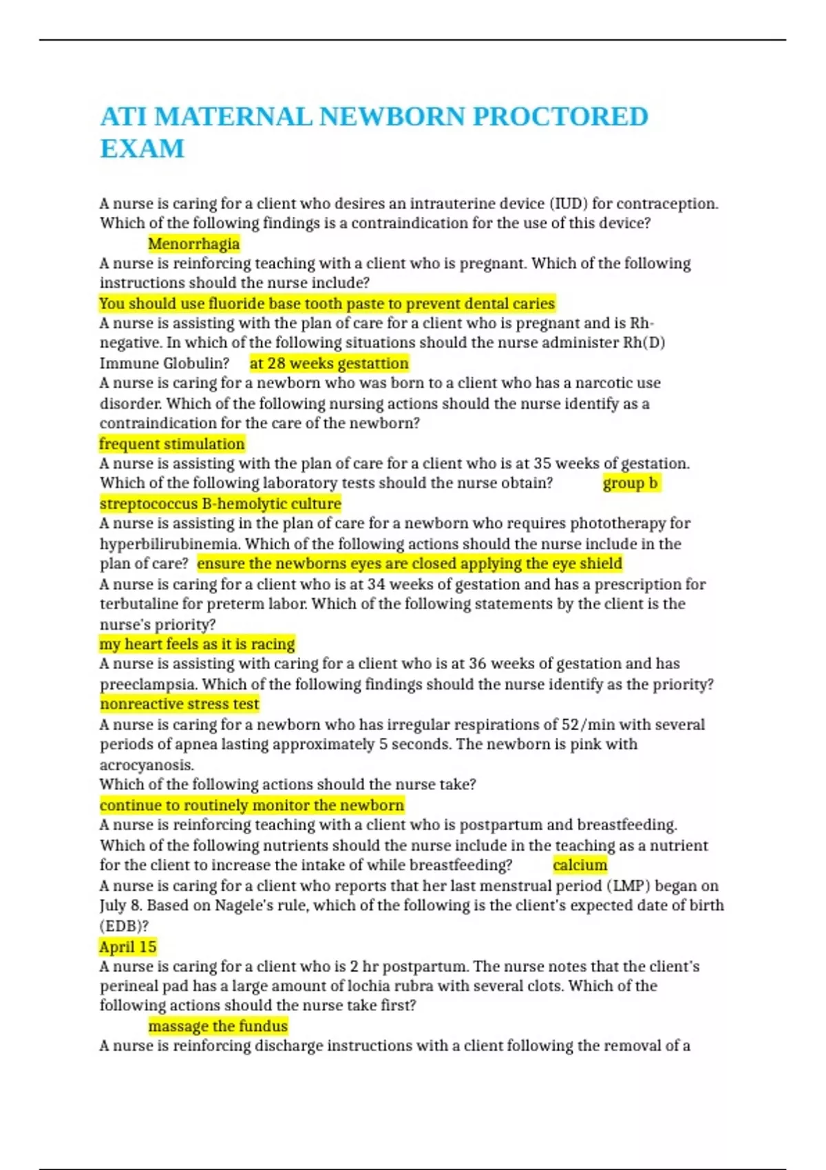 ATI PHARMACOLOGY PROCTORED EXAM 2023 -Correct & Verified Questions with Answers 1. A nurse is providing teaching to a group of new parents about medications. The nurse should include that aspirin is contraindicated for children who have a viral infection due to the risk of developing which of the following adverse effects? a. Reye's syndrome b. Visual disturbances c. Diabetes mellitus d. Wilm's tumor ANS: A 2. A nurse is providing teaching to a client who has chronic kidney failure with an AV fistula for hemodialysis and new prescription for epoetin alfa. Which of the following therapeutic effects of epoetin alfa should the nurse include in the teaching? a. Reduces blood pressure b. Inhibits clotting of fistula c. Promotes RBC production d. Stimulates growth of neutrophils ANS: C 3. A nurse is caring for a client who has peptic ulcer disease and reports a headache. Which of the following medications should the nurse plan to administer? a. Ibuprofen (NSAIDS) b. Naproxen (NSAIDS) c. Aspirin (NSAIDS) d. Acetaminophen (anlagesics) ANS: D 4. A nurse is caring for a client who has prescription for clopidogrel. The nurse should monitor the client for which of the following adverse effects? a. Insomnia b. Hypotension c. Bleeding Questions with Answers 1. A nurse is providing teaching to a group of new parents about medications. The nurse should include that aspirin is contraindicated for children who have a viral infection due to the risk of developing which of the following adverse effects? a. Reye's syndrome b. Visual disturbances c. Diabetes mellitus d. Wilm's tumor ANS: A 2. A nurse is providing teaching to a client who has chronic kidney failure with an AV fistula for hemodialysis and new prescription for epoetin alfa. Which of the following therapeutic effects of epoetin alfa should the nurse include in the teaching? a. Reduces blood pressure b. Inhibits clotting of fistula c. Promotes RBC production d. Stimulates growth of neutrophils ANS: C 3. A nurse is caring for a client who has peptic ulcer disease and reports a headache. Which of the following medications should the nurse plan to administer? a. Ibuprofen (NSAIDS) b. Naproxen (NSAIDS) c. Aspirin (NSAIDS) d. Acetaminophen (anlagesics) ANS: D 4. A nurse is caring for a client who has prescription for clopidogrel. The nurse should monitor the client for which of the following adverse effects? a. Insomnia b. Hypotension c. Bleeding