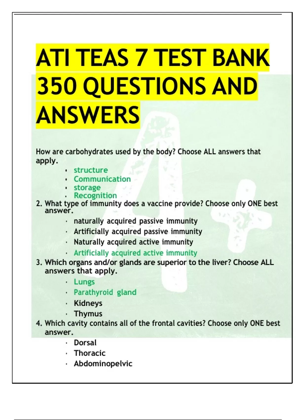 ATI TEAS 7 TEST BANK 350 QUESTIONS AND ANSWERS How are carbohydrates used by the body? Choose ALL answers that apply. • structure • Communication • storage • Recognition 2. What type of immunity does a vaccine provide? Choose only ONE best answer. • naturally acquired passive immunity • Artificially acquired passive immunity • Naturally acquired active immunity • Artificially acquired active immunity 3. Which organs and/or glands are superior to the liver? Choose ALL answers that apply. • Lungs • Parathyroid gland • Kidneys • Thymus 4. Which cavity contains all of the frontal cavities? Choose only ONE best answer. • Dorsal • Thoracic • Abdominopelvic • Ventral