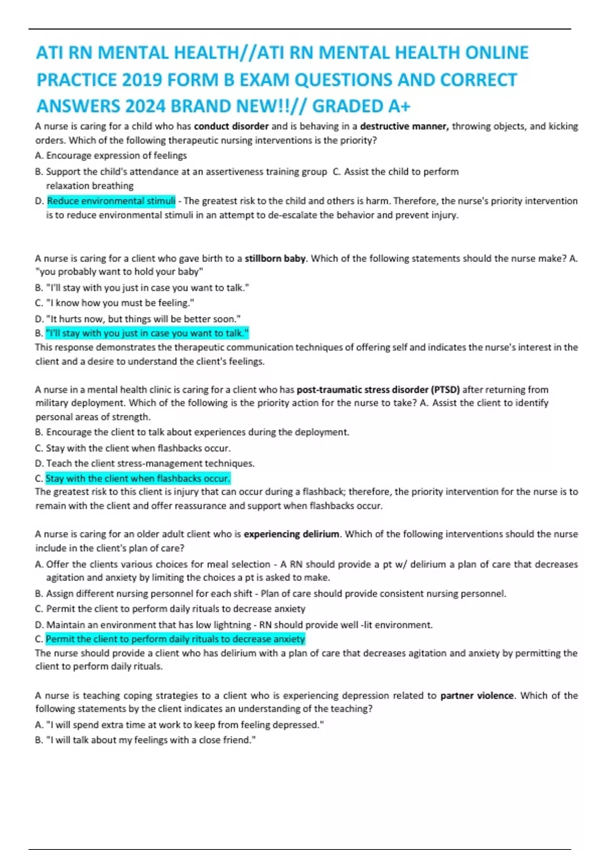 ATI RN MENTAL HEALTH//ATI RN MENTAL HEALTH ONLINE PRACTICE 2019 FORM B EXAM QUESTIONS AND CORRECT ANSWERS 2024 BRAND NEW!!// GRADED A+ A nurse is caring for a child who has conduct disorder and is behaving in a destructive manner, throwing objects, and