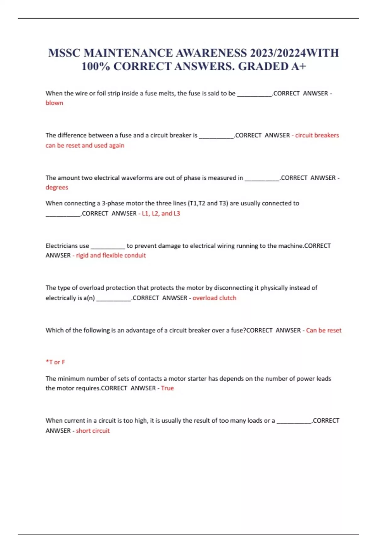 MSSC MAINTENANCE AWARENESS 2023/20224WITH 100% CORRECT ANSWERS. GRADED A+ When the wire or foil strip inside a fuse melts, the fuse is said to be __________.CORRECT ANWSER - blown The difference between a fuse and a circuit breaker is __________.CORRECT ANWSER - circuit breakers can be reset and used again