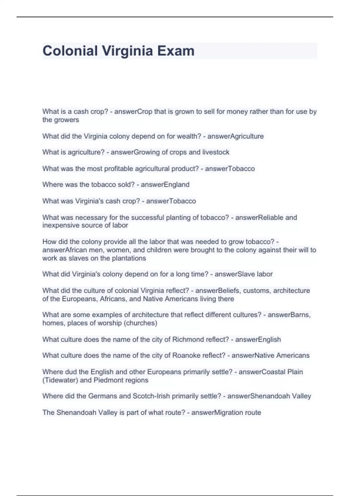 Colonial Virginia Exam Questions with solutions 2024