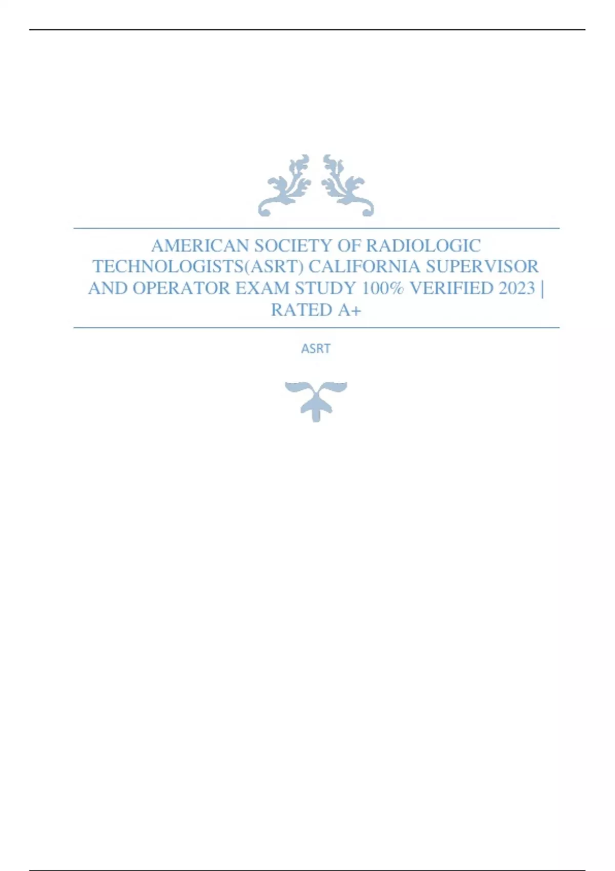 AMERICAN SOCIETY OF RADIOLOGIC TECHNOLOGISTS(ASRT) CALIFORNIA SUPERVISOR AND OPERATOR EXAM STUDY 100% VERIFIED 2023 | RATED A+