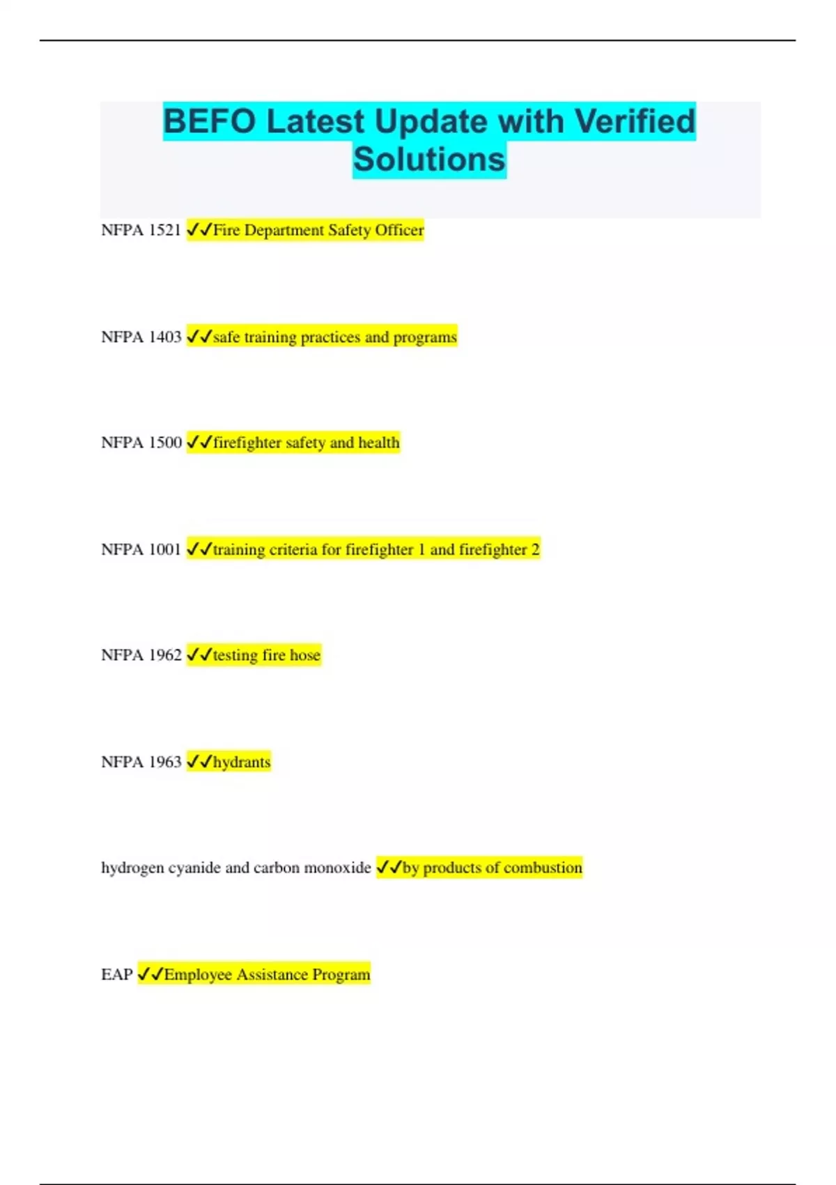 BEFO Latest Update with Verified Solutions NFPA 1521 Fire Department Safety Officer NFPA 1403 safe training practices and programs NFPA 1500 firefighter safety and health NFPA 1001 training criteria for firefighter 1 and firefighter 2 NFPA 1962 testing fire hose NFPA 1963 hydrants hydrogen cyanide and carbon monoxide by products of combustion EAP Employee Assistance Program PSAP Public Safety Answering Point (ROC.) NFPA 1221 how emergency calls are to be handled how to take a 911 call location, type, number people involved, location half duplex radios one person talks at a time full duplex radio system both talk at same time trunked radio system uses best Tower transmits radio to digital Steel sales at 1000° lengthens when heated building type 1 World Trade Centers, fire restistive building type 2 Lowe's non combustible building type 3 repurposed buildings, Maine components are non-combustible. ordinary. Old Brick apartment buildings. building Type 4 heavy Timber. Large Dimension wood. Old Mills. building type 5 wood frame. 90% of what we have. Sticks & Bricks. fire keep producing chemical reaction between a fuel and an oxidizer exothermic vs. endothermic reaction heating up vs cooling down fire tetrahedron fuel or reducing agent, heat, oxidizing agent, chemical chain reaction conduction the transfer of energy as heat through a material Vapor density weight of a given volume of Pure Vapor compared to dry air pyrolysis the decomposition of solid organic matter by heat before combustion fuel Vapor to air mixture determines lower or upper explosive range Flashpoint The lowest temperature at which a combustible material will produce an ignitable vapor. Fire Point The temperature at which enough vapors are given off to support continuous burning. stages of burning incipient, growth, fully developed, flashover, decay class D metals sodium potassium lithium magnesium monoammonium phosphate dry chem material NFPA 1983 Standard on Life Safety Rope and Equipment for Emergency Services laid rope utility rope only NFPA 1931 and 1932 design, and use and care of ground ladders NFPA 1901 apparatus mounted to ground ladders