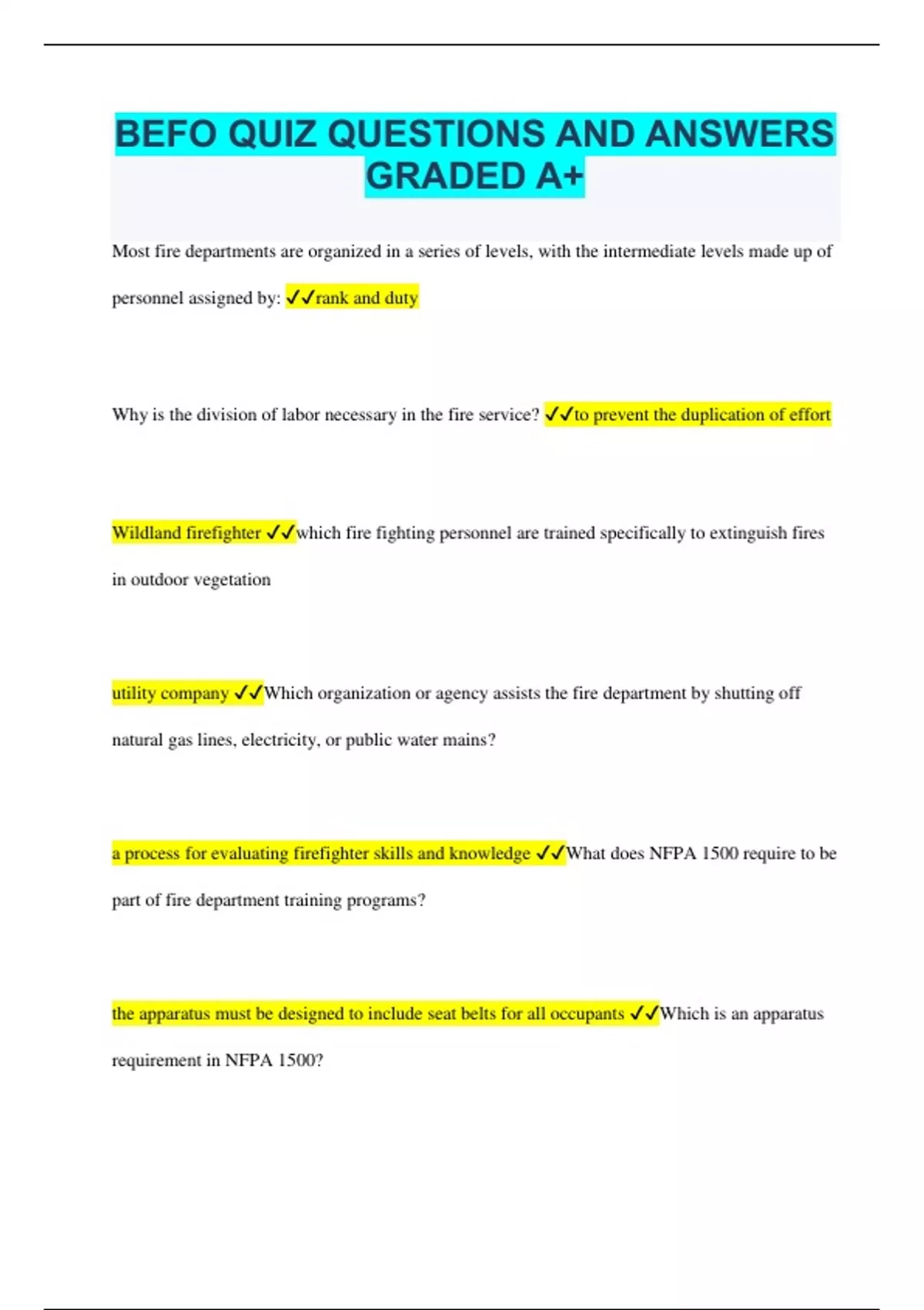 BEFO QUIZ QUESTIONS AND ANSWERS GRADED A+