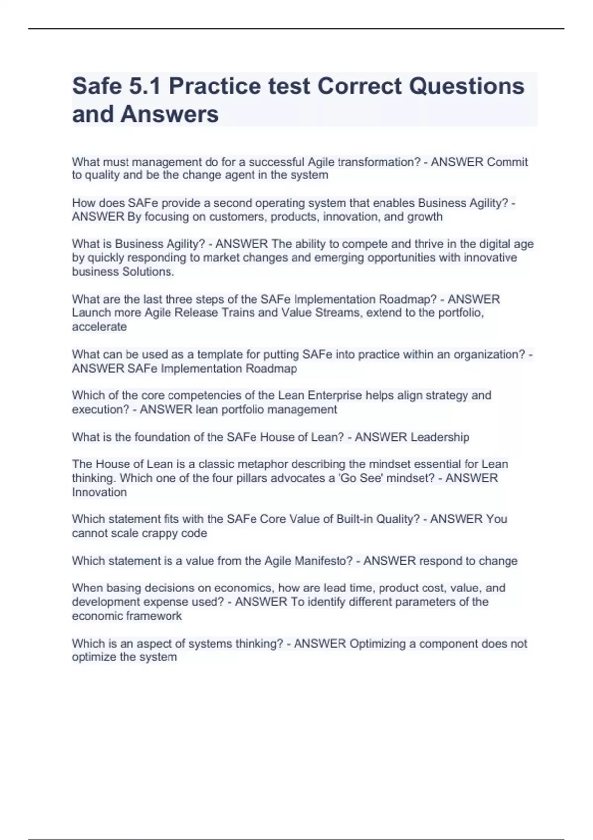 What must management do for a successful Agile transformation? - ANSWER Commit to quality and be the change agent in the system How does SAFe provide a second operating system that enables Business Agility? - ANSWER By focusing on customers, products, innovation, and growth What is Business Agility? - ANSWER The ability to compete and thrive in the digital age by quickly responding to market changes and emerging opportunities with innovative business Solutions. What are the last three steps of the SAFe Implementation Roadmap? - ANSWER Launch more Agile Release Trains and Value Streams, extend to the portfolio, accelerate What can be used as a template for putting SAFe into practice within an organization? - ANSWER SAFe Implementation Roadmap Which of the core competencies of the Lean Enterprise helps align strategy and execution? - ANSWER lean portfolio management What is the foundation of the SAFe House of Lean? - ANSWER Leadership The House of Lean is a classic metaphor describing the mindset essential for Lean thinking. Which one of the four pillars advocates a 'Go See' mindset? - ANSWER Innovation Which statement fits with the SAFe Core Value of Built-in Quality? - ANSWER You cannot scale crappy code Which statement is a value from the Agile Manifesto? - ANSWER respond to change When basing decisions on economics, how are lead time, product cost, value, and development expense used? - ANSWER To identify different parameters of the economic framework Which is an aspect of systems thinking? - ANSWER Optimizing a component does not optimize the system What are the three primary keys to implementing flow? (Choose three.) - ANSWER Reduce the batch sizes of work;Visualize and limit work in process (WIP);Manage queue lengths; What is an example of applying cadence-based synchronization in SAFe? - ANSWER Teams align their iterations to the same schedule to support communication, coordination, and system integration What is one benefit of unlocking the intrinsic motivation of knowledge workers? - ANSWER To provide autonomy with purpose, mission, and minimum constraints What is the biggest benefit of decentralized decision-making? - ANSWER delivering value in shortest sustainable lead time