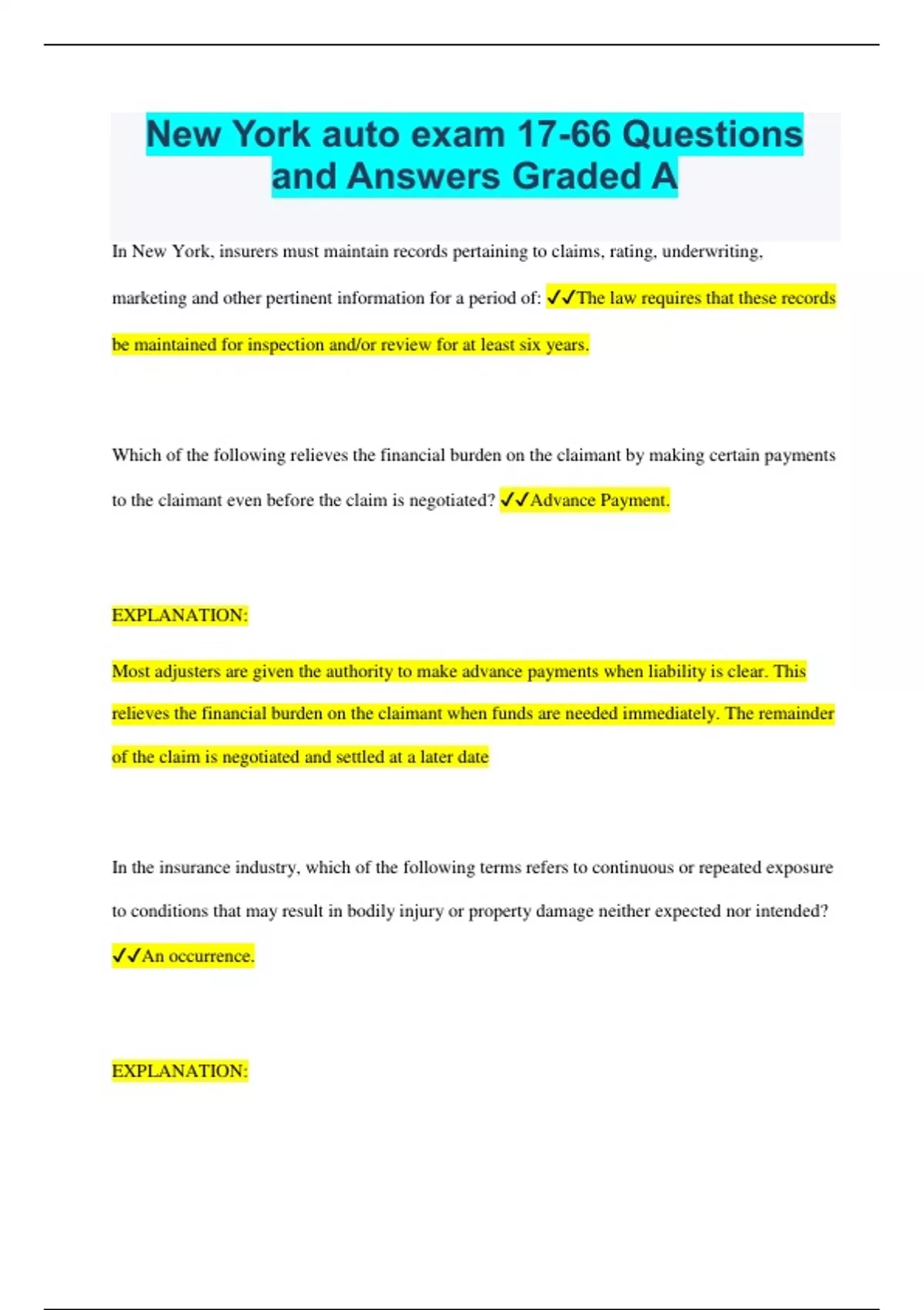 New York auto exam 17-66 Questions and Answers Graded A In New York, insurers must maintain records pertaining to claims, rating, underwriting, marketing and other pertinent information for a period of: The law requires that these records be maintained for inspection and/or review for at least six years. Which of the following relieves the financial burden on the claimant by making certain payments to the claimant even before the claim is negotiated? Advance Payment. EXPLANATION: Most adjusters are given the authority to make advance payments when liability is clear. This relieves the financial burden on the claimant when funds are needed immediately. The remainder of the claim is negotiated and settled at a later date In the insurance industry, which of the following terms refers to continuous or repeated exposure to conditions that may result in bodily injury or property damage neither expected nor intended? An occurrence. EXPLANATION: The definition of "occurrence" includes accident which is bodily injury and/or property damage that is sudden and unforeseen. If, during a legal proceeding, the court determines that the facts brought forth, together with the applicable law, fail to make a prima facie case, the court may, without consideration by the jury, administer: A directed verdict. . EXPLANATION: Lacking establishment of a prima facie case, the court may enter a directed verdict for either the plaintiff or the defendant. Which of the following is NOT a correct statement in determining the cost of a "comparable automobile" when a physical damage loss has a occurred? The cost of a comparable automobile as determined by a computerized automobile valuation service that produces statistically valid fair market values within the United States market. . EXPLANATION: The computerized method must use values that are fair market values in the local market areas and does not include markets in other parts of the United States. In New York, the limit under the Homeowner policy for credit card, electronic fund transfer card or access device, forgery and counterfeit money additional coverage is: $1,000. EXPLANATION: In NY the limit of insurance under the credit card, electronic fund transfer card or access device, forgery and counterfeit money additional coverage was increased from $500 to $1,000. Under the Motor Carrier Act of 1980, a vehicle hauling excess oil, explosives or nitrous gases is required to carry a minimum liability limit of: $5,000,000. EXPLANATION: Although oil haulers are only required to carry $1,000,000, the key word here is "excess oil" and when followed up with "explosives" makes this freight hazardous requiring the $5,000,000 limit. In New York, the insurer is required to provide claim forms to the insured within _____ of being notified of the loss. 5 days. EXPLANATION: Claim forms must be provided within 15 days after notification of the loss. Which of the following coverages would apply to a rental car used by an insured executive while on vacation? Coverage for nonowned autos. . EXPLANATION: The personal auto policy covers the use of a non-owned auto whether it be a rental car or a vehicle belonging to a friend. In New York, a lawsuit against an insurance company must be commenced within _______ after the claim. 24 months. EXPLANATION: No suit or action on a policy for the recovery of any claim will be sustainable in any court of law or equity unless all the requirements of the policy have been complied with, unless commenced within 24 months next after inception of the loss. Under the Federal Insurance Fraud and False Statements Act, if someone is prohibited from doing business in a state, approval to resume transacting business must be granted by: Submitting a 1033 waiver form and having it approved by an insurance regulatory official in his or her state.. EXPLANATION: Only an insurance regulatory official, such as the Insurance Commissioner, can grant permission to resume business. The BAP uses Symbol 7 to cover "specifically described autos" identified in the declarations. An auto acquired during the policy period will only be covered: If the insured insures all of their vehicles with the company or it replaces a covered auto. . EXPLANATION: First the insured must insure all of their vehicles they own, or the auto replaces a covered auto. In either case the insured must notify the insurance company of the change. An insurer in New York is required to acknowledge receipt of notice of a claim within: 5 working days.. EXPLANATION: Every insurer, upon notification of a claim, must, within 15 working days, acknowledge the receipt of the notice. The acknowledgment may be in writing. If an acknowledgment is made by other means, an appropriate notation must be made in the claim file of the insurer. Which of the following would NOT be covered under coverage C, the Uninsured and Underinsured Motorist Coverage? Vehicles. EXPLANATION: This coverage does not apply to physical damage to other vehicles. In some states the insured can elect to purchase uninsured motorist property damage coverage that would apply to the insured's vehicle. Special damages are those that the adjuster can assign a dollar amount such as medical expenses and loss of wages. General damages deal with soft tissue injuries or pain and suffering where the damages are usually determined at a later date and negotiated with the insured. What type of liability is specifically addressed by statute? Strict Liability. EXPLANATION: Strict liability is specifically addressed by statute. Basically there is little if any defense on the part of the negligent party. Products liability is often the subject of strict liability claims. Liability coverage under the personal auto policy includes: The correct answer is: Both bodily injury and property damage coverage. EXPLANATION: The policy provides both bodily injury and property damage liability coverage. It does not cover the insured's personal property or personal property