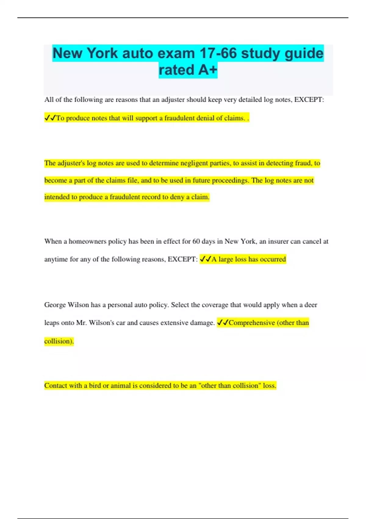New York auto exam 17-66 study guide rated A+ All of the following are reasons that an adjuster should keep very detailed log notes, EXCEPT: To produce notes that will support a fraudulent denial of claims. . The adjuster's log notes are used to determine negligent parties, to assist in detecting fraud, to become a part of the claims file, and to be used in future proceedings. The log notes are not intended to produce a fraudulent record to deny a claim. When a homeowners policy has been in effect for 60 days in New York, an insurer can cancel at anytime for any of the following reasons, EXCEPT: A large loss has occurred George Wilson has a personal auto policy. Select the coverage that would apply when a deer leaps onto Mr. Wilson's car and causes extensive damage. Comprehensive (other than collision). Contact with a bird or animal is considered to be an "other than collision" loss. What is the purpose of the New York automobile inspection requirement? To determine prior damage to the vehicle . The purpose of the New York automobile inspection requirement is to determine if there was prior damage to the vehicle at the time coverage was put into effect. The law recognizes two types of waivers. They are: Express/implied. They are express and implied. An express waiver occurs when the insurer or its representative knowingly gives up a known right under the insurance contract. Perhaps the right to request an appraisal of the damaged property is an example. By comparison, an implied waiver may be the result from some act of neglect on the part of the adjuster. In New York, how often may the Superintendent examine insurers doing business in the state? As often as he/she deems necessary. Duplicate recovery under New York No-Fault coverage is not permitted. If the employee is covered under the employer's auto policy what might be done to the employee's personal auto insurance coverage: PP 05 92 will exclude medical expenses from the basic economic loss coverage for no-fault benefits. With commercial lines, endorsement CA 22 49 can be used. The premiums for the basic economic loss (PIP) will be reduced accordingly. What symbol is used for a hired auto in a commercial automobile policy? Symbol 8 is used to provide hired auto coverage in a commercial automobile policy. It also includes leased, rented or borrowed. A New York licensee subject to an administrative action in another jurisdiction or governmental agency must report such action to the Superintendent within: The Superintendent must be notified within 30 days of the final disposition of the matter. Jim Johnson has an automobile policy with a combined single limit of $50,000. He has an at-fault accident and incurs the following expenses: $30,000 bodily injury judgment; $30,000 property damage judgment; $5,000 damage to traffic light; $6,000 attorney's fees for his defense; $300 in premiums for appeal bond; and $75 in bail bond premiums for related traffic violations. What is the maximum amount his insurance company will pay? 56,375 The policy cannot pay more than its limit of liability. Under supplemental coverages in the policy, the policy will pay the defense costs plus the cost of the premiums on appeal bonds and bail bonds. What is the meaning of "diminution of value?" A reduction in the value of a vehicle even after repairs have been made Which of the following is NOT true concerning the Terrorism Risk Insurance Program Reauthorization Act of 2015? The coverage is not mandatory and can be rejected. Under the 2015 extension, an act of terrorism must be certified by the Secretary of Treasury in concurrence with the Secretary of Homeland Secretary (previously it was the in concurrence with the Secretary of State) and the United State Attorney General. David has damaged his vehicle by striking a tree. He can: I. Take the car to a repair garage recommended by the insurer. II. Take the car to a garage of his choice. III. Accept payment based on the adjuster's estimate. The correct answer is: I, II and III. The choice belongs to the David, the insured Substitute Services under NY no fault benefits will provide: The correct answer is: $25 per day for one year. EXPLANATION: Basic economic loss benefits will provide up to $25 per day for substitute services for a maximum of one year if the injured party is not gainfully employed. What is the penalty for committing a fraudulent insurance practice in New York? $5,000 plus the amount of the claim. EXPLANATION: In addition to any criminal liability, the Superintendent is empowered to levy a civil penalty not exceeding $5,000 plus the amount of the claim for each violation upon any person, including licensees and their employees. An insurance professional that is accused of dishonesty or breach of trust involving interstate commerce under Title 18 Section 1033 of the United State Code, will be prosecuted by: The U.S. Attorney general.. EXPLANATION: This breach of trust or dishonesty involving interstate commerce is a violation of USC 1033 and therefore prosecuted by the United States Attorney General's office. Under the commercial auto policy providing physical damage, which of the following offers the broadest coverage? Comprehensive.. EXPLANATION: Comprehensive coverage would be the broadest because it covers anything that is not defined as collision. The specified cause of loss is a named peril form and thus, is more limited. Driver 1 and Driver 2 are in an accident. Driver 2 has the following damages: Property Damage - $1,000 Rental Car Expense - $500 Emergency Room Expense - $400 Lost Wages - $300 The extent of the bodily injury will not be known for six months. How should the adjuster on this claim pay damages for Driver 2? Pay the property damage and rental car expense and settle the bodily injury at a later time.. EXPLANATION: In this case the adjuster should pay for the parts of the claim where he can easily determine its value. He should seek a partial release for these items. He can then s