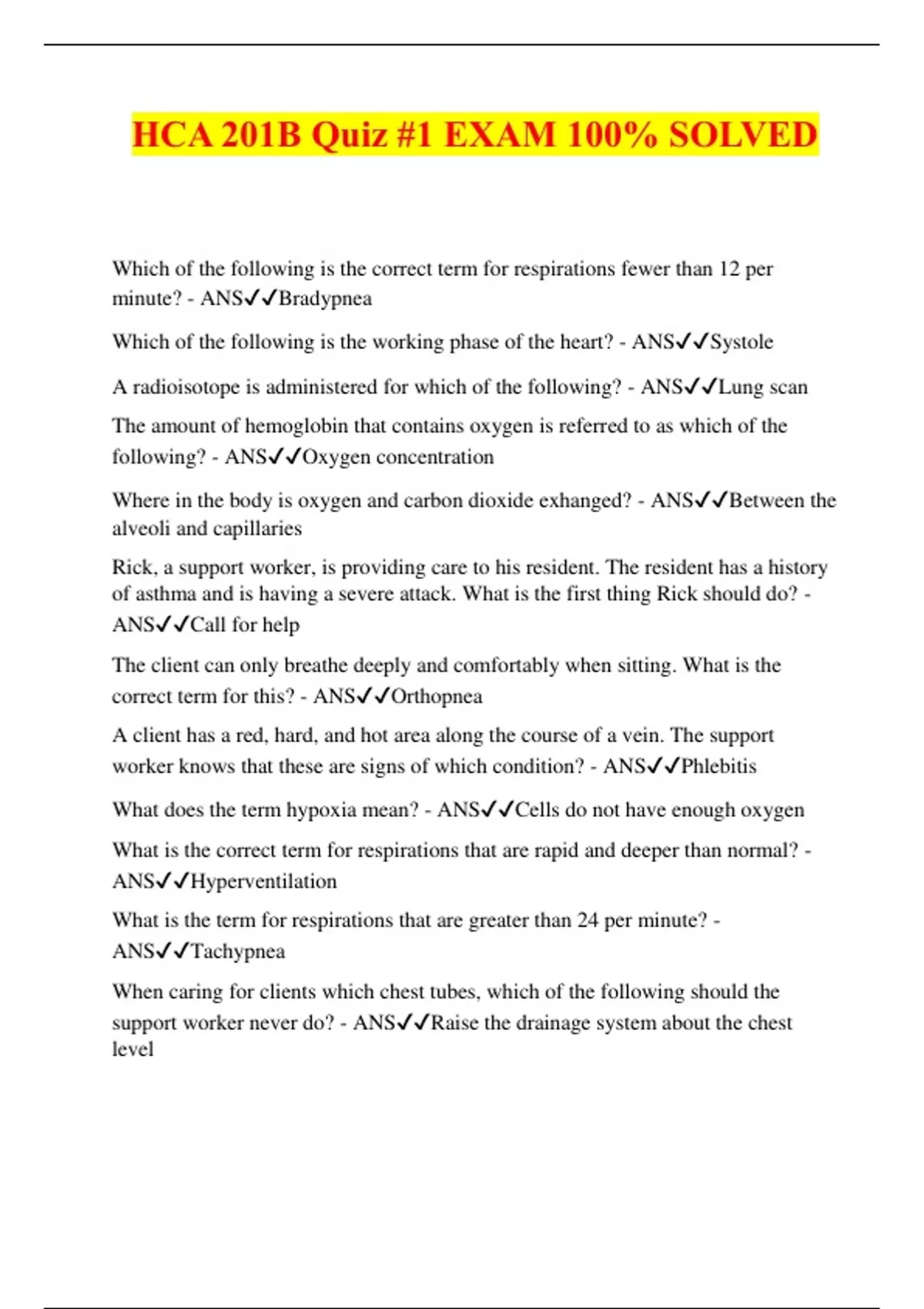 HCA 201B Quiz #1 EXAM 100% SOLVED Which of the following is the correct term for respirations fewer than 12 per minute? - ANSBradypnea Which of the following is the working phase of the heart? - ANSSystole A radioisotope is administered for which of the following? - ANSLung scan The amount of hemoglobin that contains oxygen is referred to as which of the following? - ANSOxygen concentration Where in the body is oxygen and carbon dioxide exhanged? - ANSBetween the alveoli and capillaries Rick, a support worker, is providing care to his resident. The resident has a history of asthma and is having a severe attack. What is the first thing Rick should do? - ANSCall for help The client can only breathe deeply and comfortably when sitting. What is the correct term for this? - ANSOrthopnea A client has a red, hard, and hot area along the course of a vein. The support worker knows that these are signs of which condition