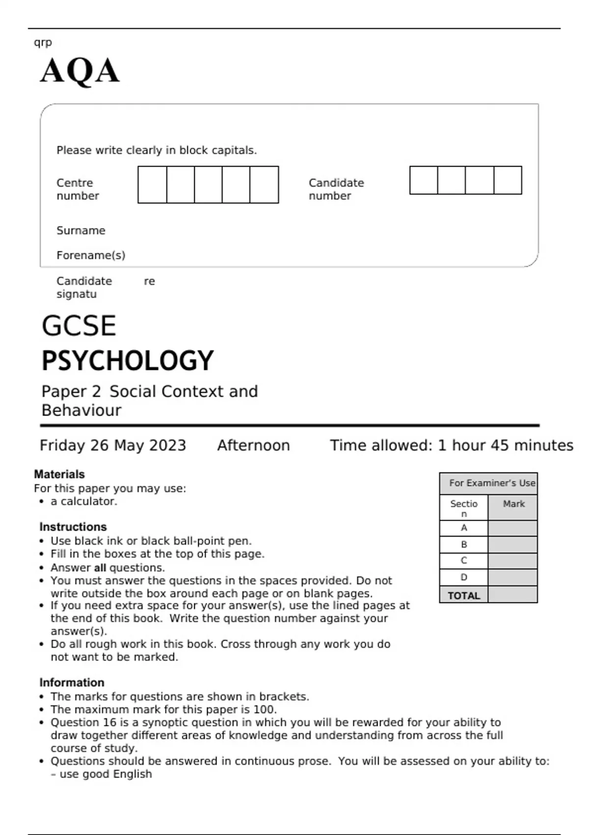 AQA GCSE PSYCHOLOGY Paper 2 JUNE 2023 QUESTION PAPER: Social Context and Behaviour