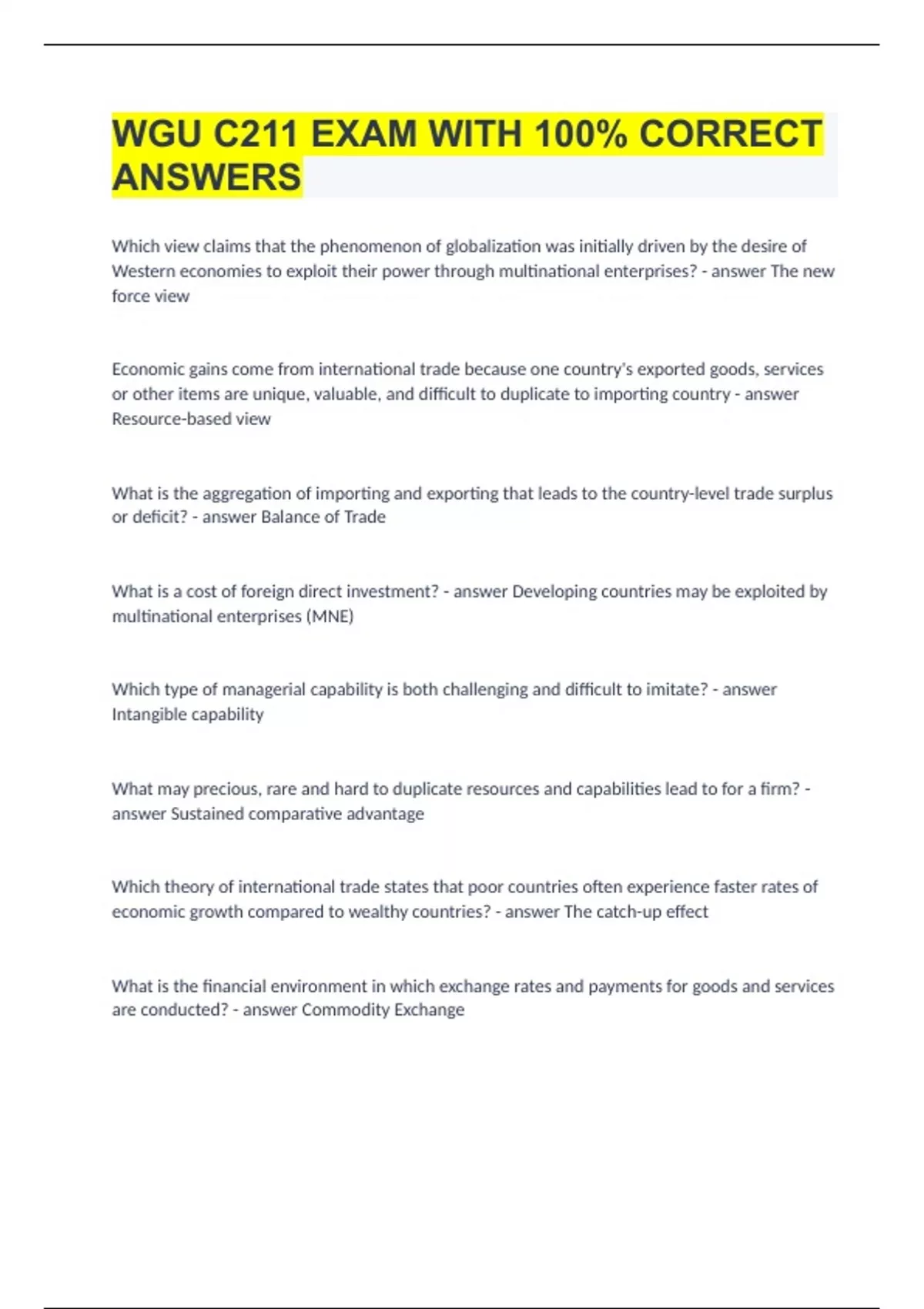 WGU C211 EXAM WITH 100% CORRECT ANSWERS Which view claims that the phenomenon of globalization was initially driven by the desire of Western economies to exploit their power through multinational enterprises? - answer The new force view Economic gains come from international trade because one country's exported goods, services or other items are unique, valuable, and difficult to duplicate to importing country - answer Resource-based view What is the aggregation of importing and exporting that leads to the country-level trade surplus or deficit? - answer Balance of Trade What is a cost of foreign direct investment? - answer Developing countries may be exploited by multinational enterprises (MNE) Which type of managerial capability is both challenging and difficult to imitate? - answer Intangible capability What may precious, rare and hard to duplicate resources and capabilities lead to for a firm? - answer Sustained comparative advantage