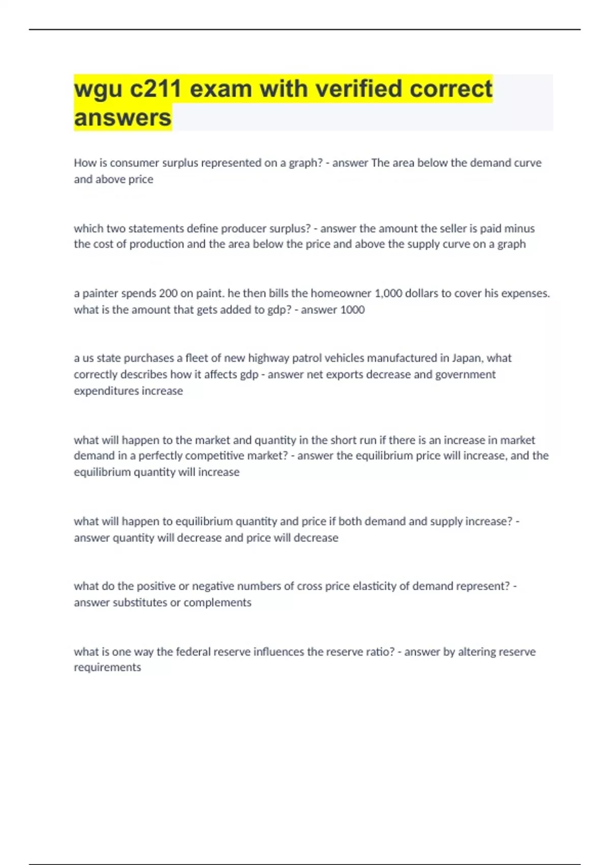 wgu c211 exam with verified correct answers How is consumer surplus represented on a graph? - answer The area below the demand curve and above price which two statements define producer surplus? - answer the amount the seller is paid minus the cost of production and the area below the price and above the supply curve on a graph a painter spends 200 on paint. he then bills the homeowner 1,000 dollars to cover his expenses. what is the amount that gets added to gdp? - answer 1000 a us state purchases a fleet of new highway patrol vehicles manufactured in Japan, what correctly describes how it affects gdp - answer net exports decrease and government expenditures increase what will happen to the market and quantity in the short run if there is an increase in market demand in a perfectly competitive market? - answer the equilibrium price will increase, and the equilibrium quantity will increase what will happen to equilibrium quantity and price if both demand and supply increase? - answer quantity will decrease and price will decrease