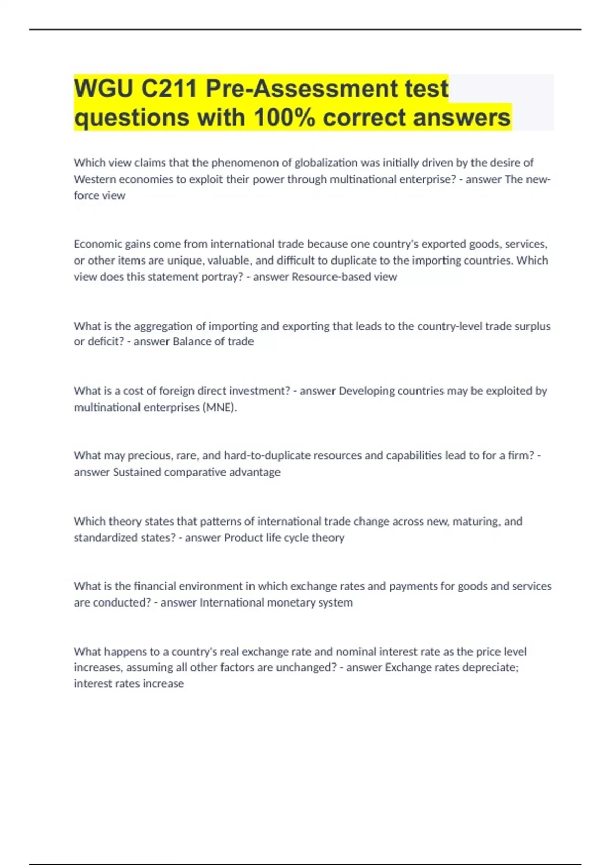 WGU C211 Pre-Assessment test questions with 100% correct answers Which view claims that the phenomenon of globalization was initially driven by the desire of Western economies to exploit their power through multinational enterprise? - answer The new-force view Economic gains come from international trade because one country's exported goods, services, or other items are unique, valuable, and difficult to duplicate to the importing countries. Which view does this statement portray? - answer Resource-based view What is the aggregation of importing and exporting that leads to the country-level trade surplus or deficit? - answer Balance of trade What is a cost of foreign direct investment? - answer Developing countries may be exploited by multinational enterprises (MNE). What may precious, rare, and hard-to-duplicate resources and capabilities lead to for a firm? - answer Sustained comparative advantage Which theory