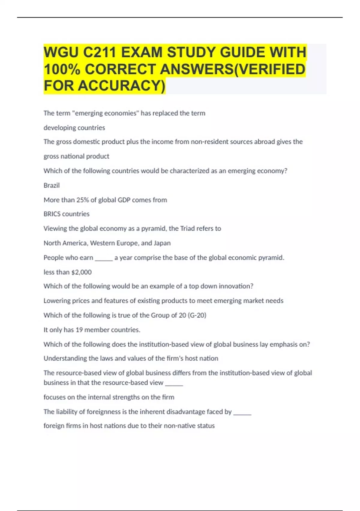 WGU C211 EXAM STUDY GUIDE WITH 100% CORRECT ANSWERS(VERIFIED FOR ACCURACY) The term "emerging economies" has replaced the term developing countries The gross domestic product plus the income from non-resident sources abroad gives the gross national product Which of the following countries would be characterized as an emerging economy? Brazil More than 25% of global GDP comes from BRICS countries Viewing the global economy as a pyramid, the Triad refers to North America, Western Europe, and Japan People who earn _____ a year comprise the base of the global economic pyramid. less