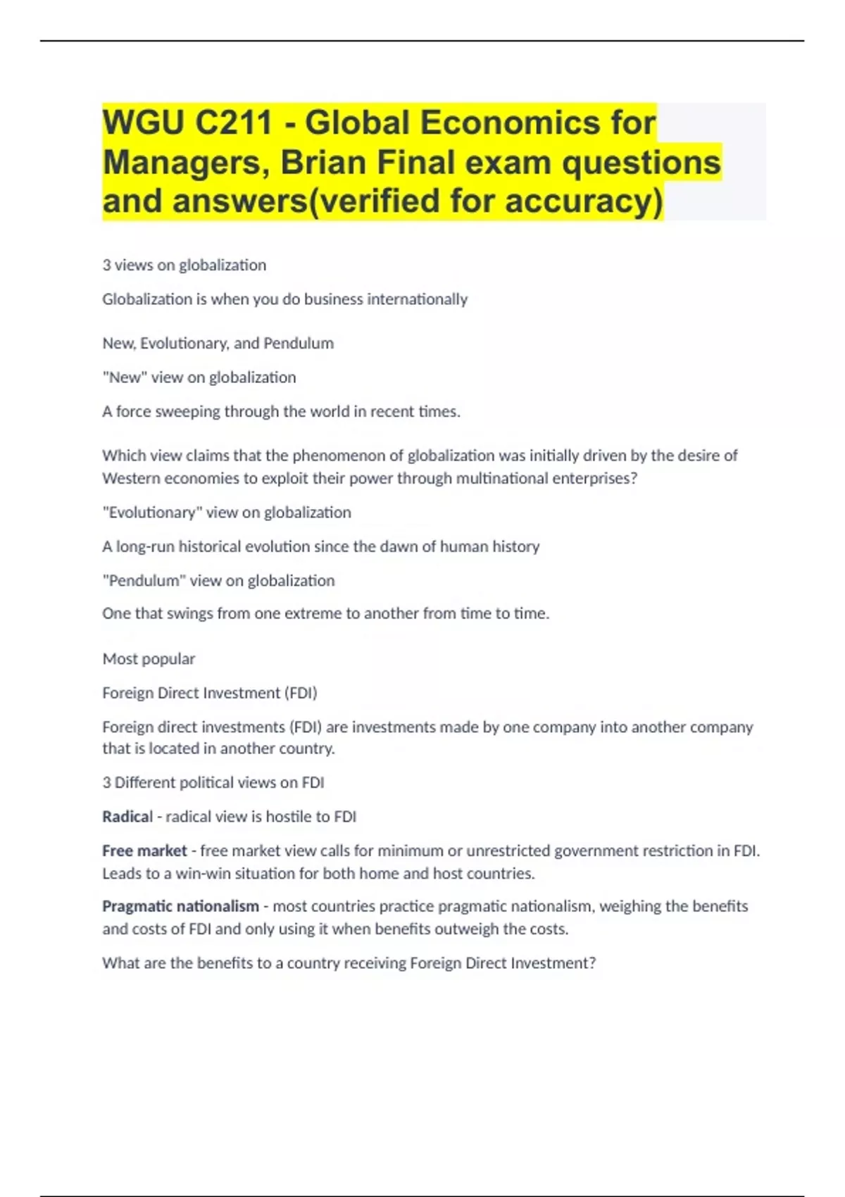 WGU C211 - Global Economics for Managers, Brian Final exam questions and answers(verified for accuracy) 3 views on globalization Globalization is when you do business internationally New, Evolutionary, and Pendulum "New" view on globalization A force sweeping through the world in recent times. Which view claims that the phenomenon of globalization was initially driven by the desire of Western economies to exploit their power through multinational enterprises? "Evolutionary" view on globalization A long-run historical evolution since the dawn of human history "Pendulum" view on globalization One that swings from one extreme to another from time to time. Most popular Foreign Direct Investment (FDI) Foreign direct investments (FDI) are investments made by one company into another company