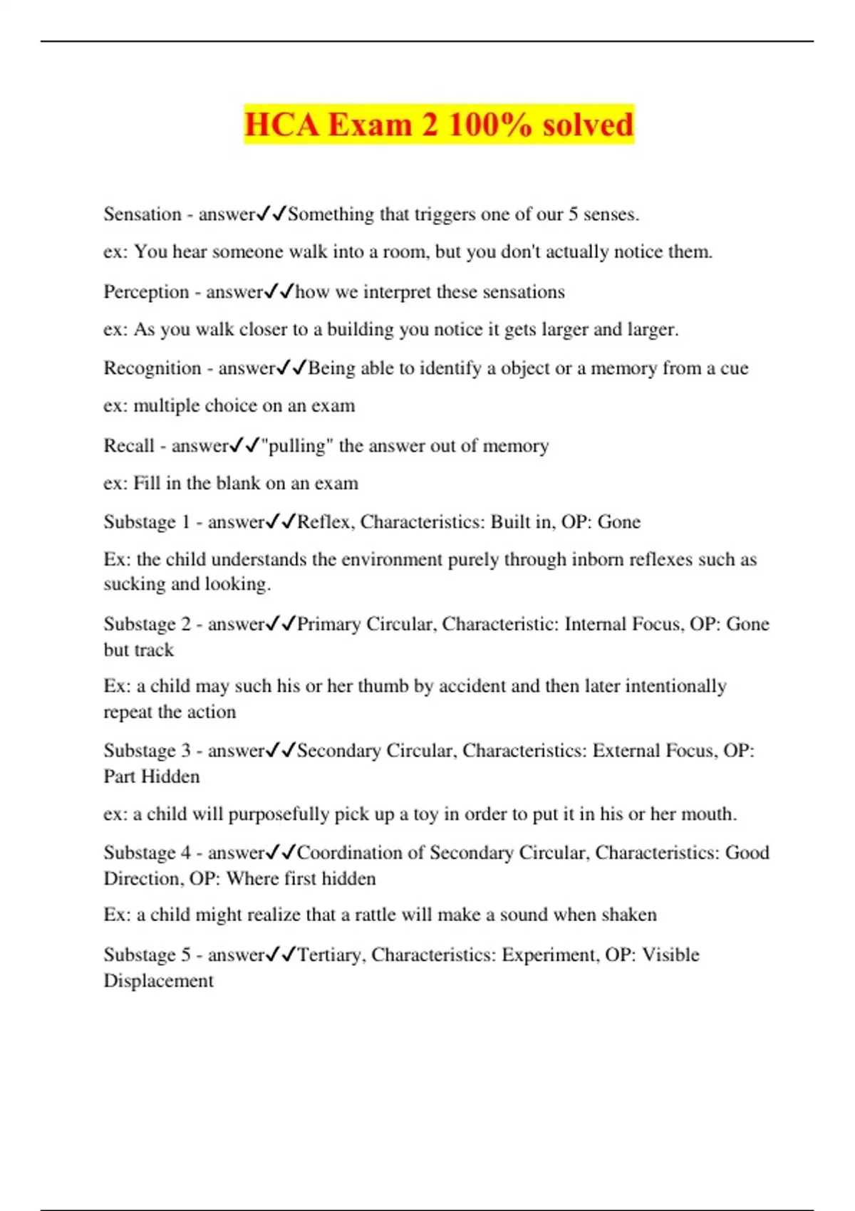 HCA Exam 2 100% solved Sensation - answerSomething that triggers one of our 5 senses. ex: You hear someone walk into a room, but you don't actually notice them. Perception - answerhow we interpret these sensations ex: As you walk closer to a building you notice it gets larger and larger. Recognition - answerBeing able to identify a object or a memory from a cue ex: multiple choice on an exam Recall - answer"pulling" the answer out of memory ex: Fill in the blank on an exam