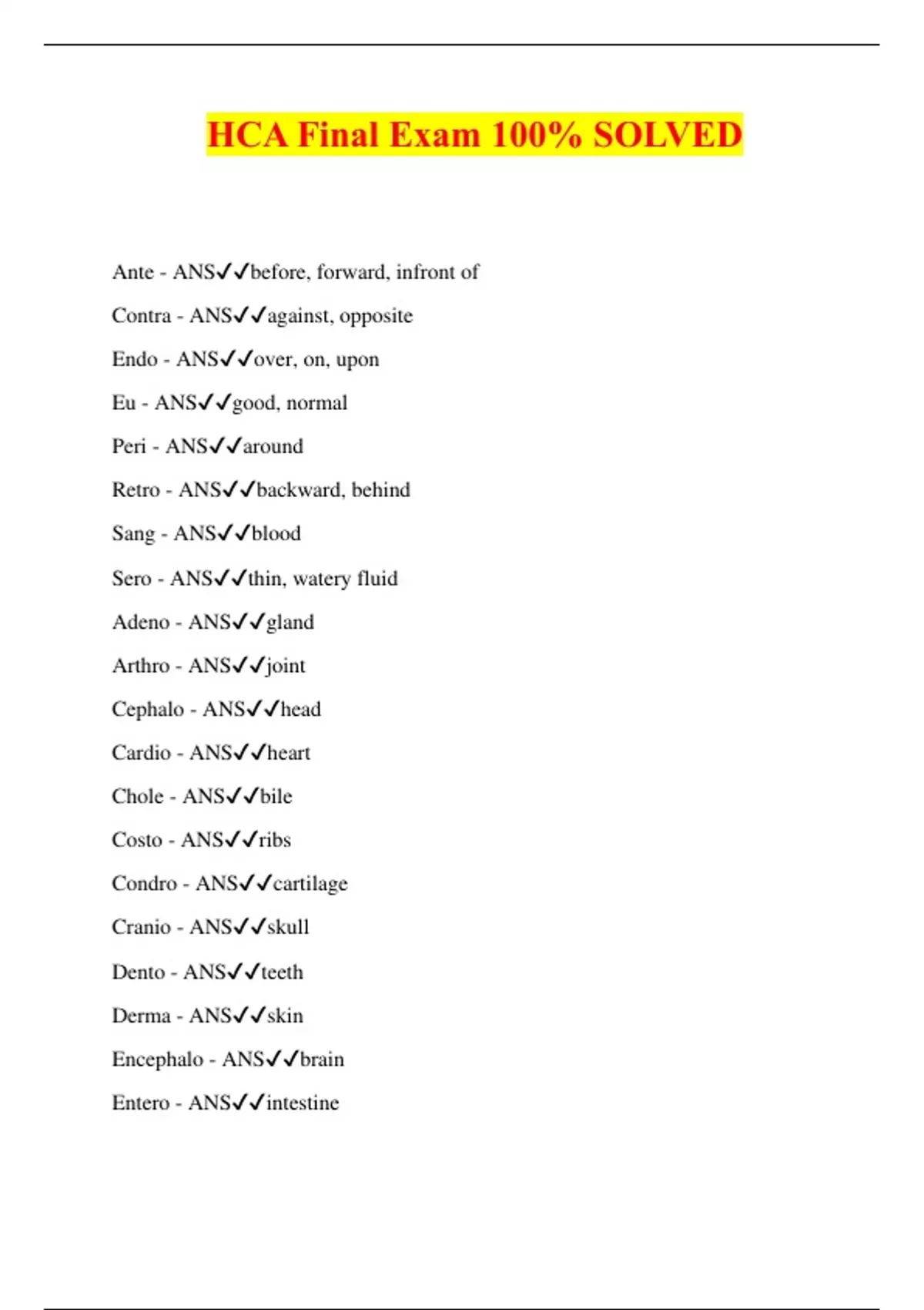 HCA Final Exam 100% SOLVED Ante - ANSbefore, forward, infront of Contra - ANSagainst, opposite Endo - ANSover, on, upon Eu - ANSgood, normal Peri - ANSaround Retro - ANSbackward, behind Sang - ANSblood