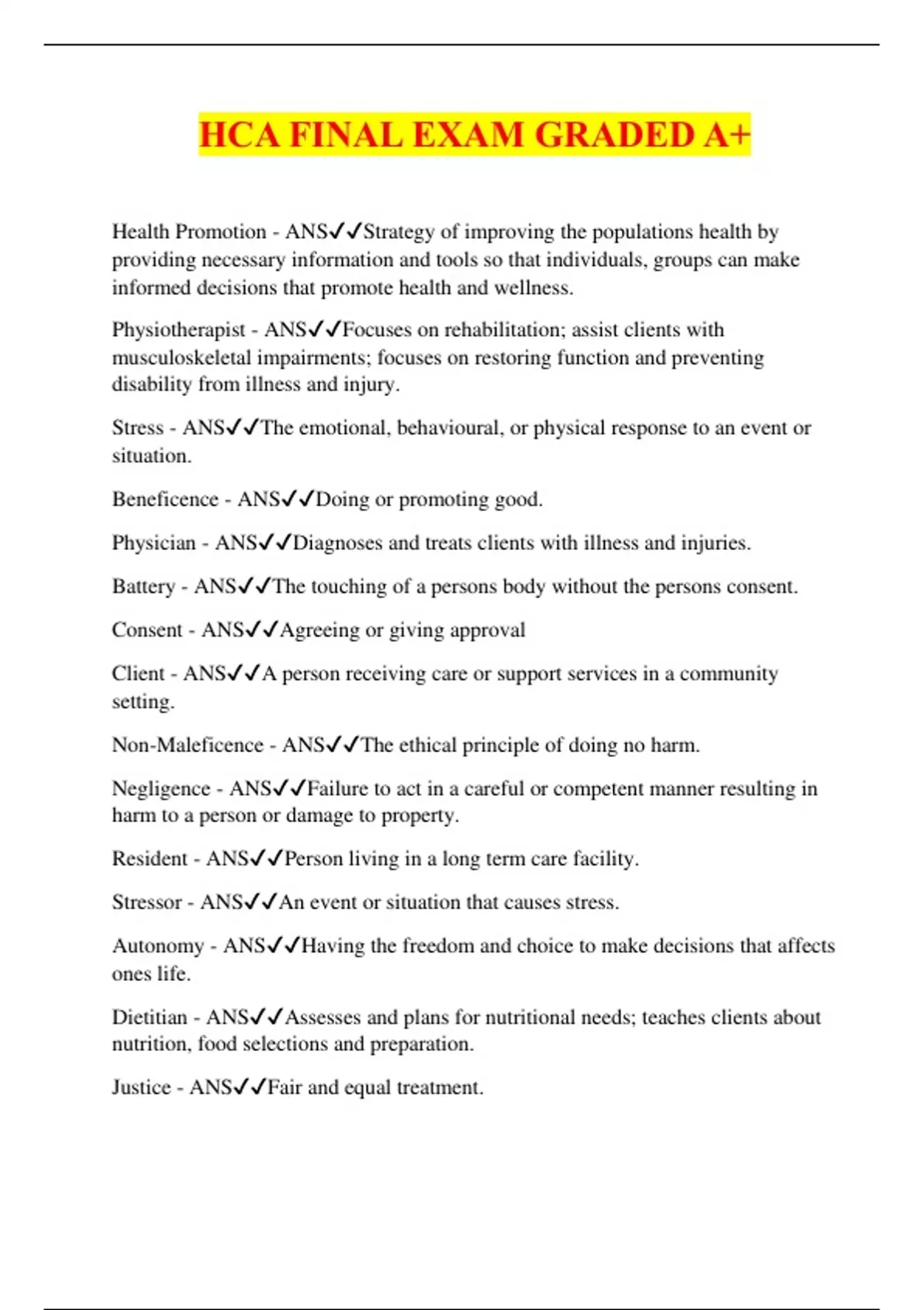 HCA FINAL EXAM GRADED A+ Health Promotion - ANSStrategy of improving the populations health by providing necessary information and tools so that individuals, groups can make informed decisions that promote health and wellness. Physiotherapist - ANSFocuses on rehabilitation; assist clients with musculoskeletal impairments; focuses on restoring function and preventing disability from illness and injury. Stress - ANSThe emotional, behavioural, or physical response to an event or situation. Beneficence - ANSDoing or promoting good. Physician - ANSDiagnoses and tr