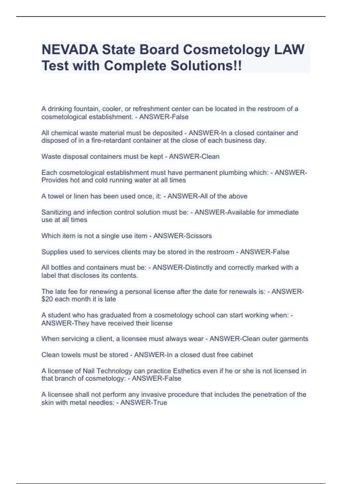 All chemical waste material must be deposited - ANSWER-In a closed container and disposed of in a fire-retardant container at the close of each business day. Waste disposal containers must be kept - ANSWER-Clean Each cosmetological establishment must have permanent plumbing which: - ANSWER-Provides hot and cold running water at all times A towel or linen has been used once, it: - ANSWER-All of the above Sanitizing and infection control solution must be: - ANSWER-Available for immediate use at all times Which item is not a single use item - ANSWER-Scissors Supplies used to services clients may be stored in the restroom - ANSWER-False All bottles and containers must be: - ANSWER-Distinctly and correctly marked with a label that discloses its contents. The late fee for renewing a personal license after the date for renewals is: - ANSWER-$20 each month it is late A student who has graduated from a cosmetology school can start working when: - ANSWER-They have received their license When servicing a client, a licensee must always wear - ANSWER-Clean outer garments Clean towels must be stored - ANSWER-In a closed dust free cabinet A licensee of Nail Technology can practice Esthetics even if he or she is not licensed in that branch of cosmetology: - ANSWER-False A licensee shall not perform any invasive procedure that includes the penetration of the skin with metal needles: - ANSWER-True