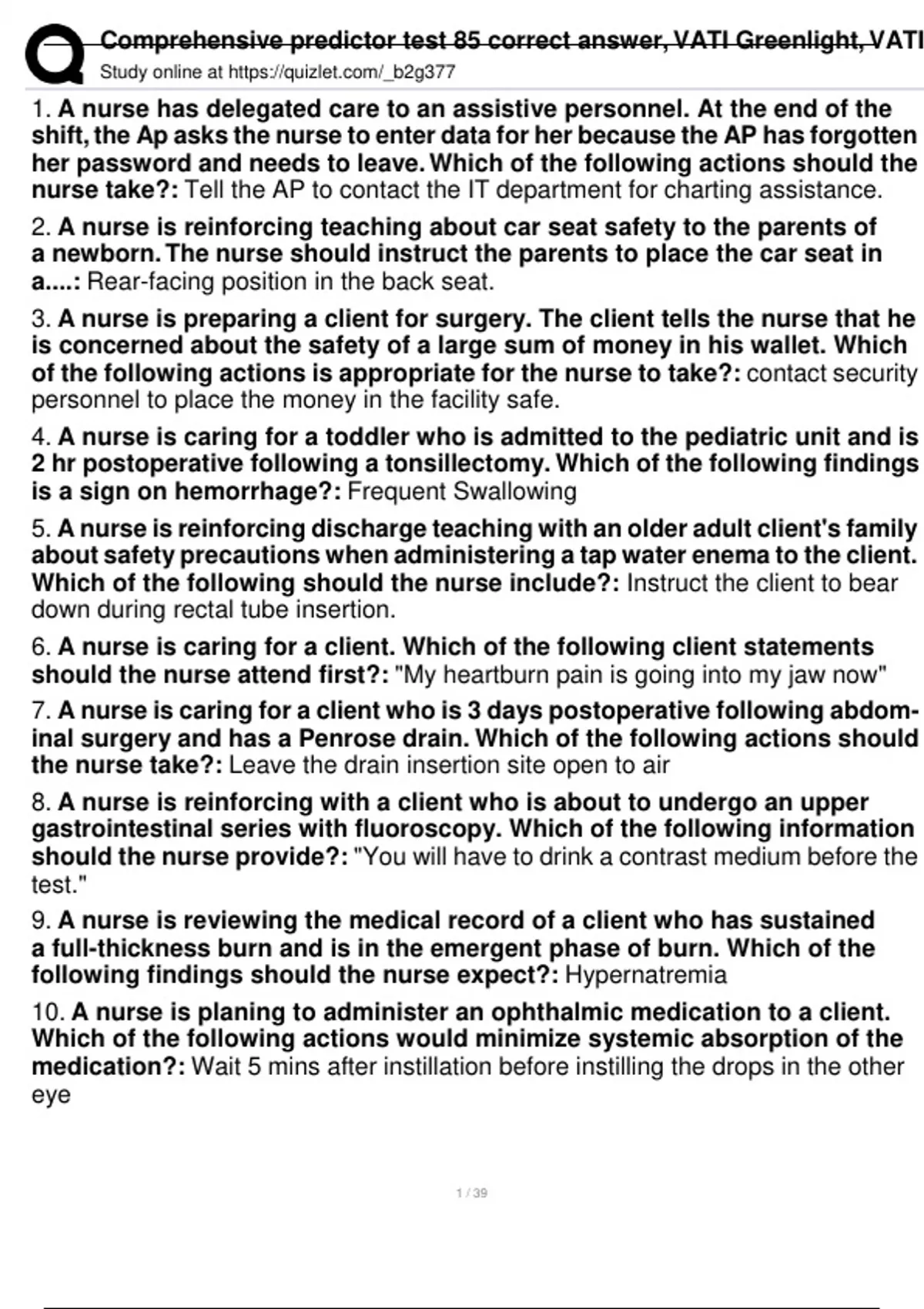COMPREHENSIVE PREDICTOR TEST 85 CORRECT ANSWER, VATI GREENLIGHT, VATI TEST BANK QUESTIONS AND ANSWERS///COMPREHENSIVE PREDICTOR TEST 85 CORRECT ANSWER, VATI GREENLIGHT, VATI TEST BANK QUESTIONS AND ANSWERS