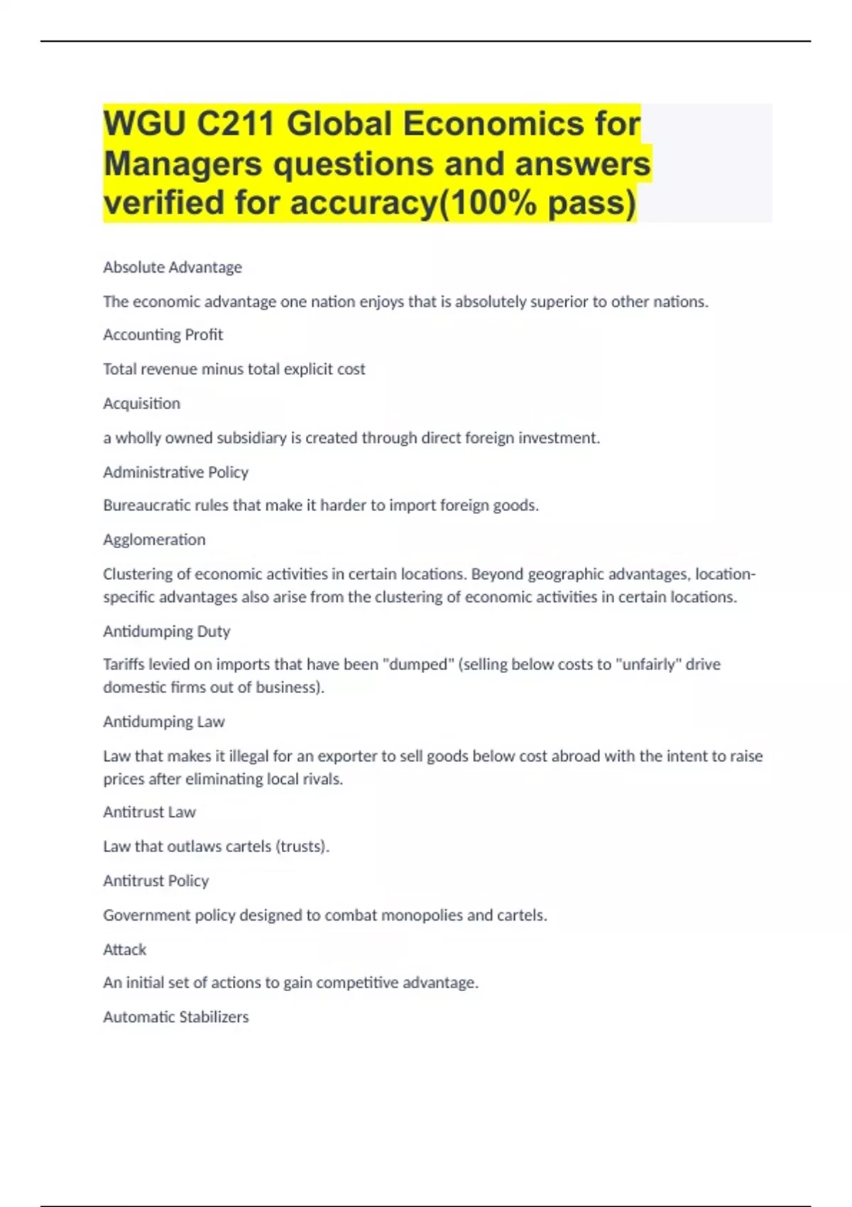 WGU C211 Global Economics for Managers questions and answers verified for accuracy(100% pass) Absolute Advantage The economic advantage one nation enjoys that is absolutely superior to other nations. Accounting Profit Total revenue minus total explicit cost Acquisition a wholly owned subsidiary is created through direct foreign investment. Administrative Policy Bureaucratic rules that make it harder to import foreign goods. Agglomeration Clustering of economic activities in certain locations. Beyond geographic advantages, location-