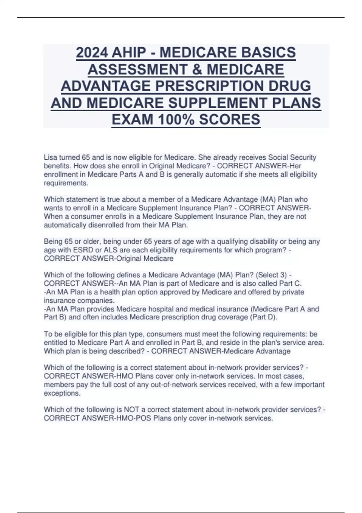 2024 AHIP - MEDICARE BASICS ASSESSMENT & MEDICARE ADVANTAGE PRESCRIPTION DRUG AND MEDICARE SUPPLEMENT PLANS EXAM 100% SCORES Lisa turned 65 and is now eligible for Medicare. She already receives Social Security benefits. How does she enroll in Original Medicare? - CORRECT ANSWER-Her enrollment in Medicare Parts A and B is generally automatic if she meets all eligibility requirements. Which statement is true about a member of a Medicare Advantage (MA) Plan who wants to enroll in a Medicare Supplement Insurance Plan? - CORRECT ANSWERWhen a consumer enrolls in a Medicare Supplement Insurance Plan, they are not automatically disenrolled from their MA Plan. Being 65 or older, being under 65 years of age with a qualifying disability or being any age with ESRD or ALS are each eligibility requirements for which program? - CORRECT ANSWER-Original Medicare Which of the following defines a Medicare Advantage (MA) Plan? (Select 3) - CORRECT ANSWER--An MA Plan is part of Medicare and is also called Part C. -An MA Plan is a health plan option approved by Medicare and offered by private insurance companies. -An MA Plan provides Medicare hospital and medical insurance (Medicare Part A and Part B) and often includes Medicare prescription drug coverage (Part D). To be eligible for this plan type, consumers must meet the following requirements: be entitled to Medicare Part A and enrolled in Part B, and reside in the plan's service area. Which plan is being described? - CORRECT ANSWER-Medicare Advantage Which of the following is a correct statement about in-network provider services? - CORRECT ANSWER-HMO Plans cover only in-network services. In most cases, members pay the full cost of any out-of-network services received, with a few important exceptions. Which of the following is NOT a correct statement about in-network provider services? - CORRECT ANSWER-HMO-POS Plans only cover in-network services
