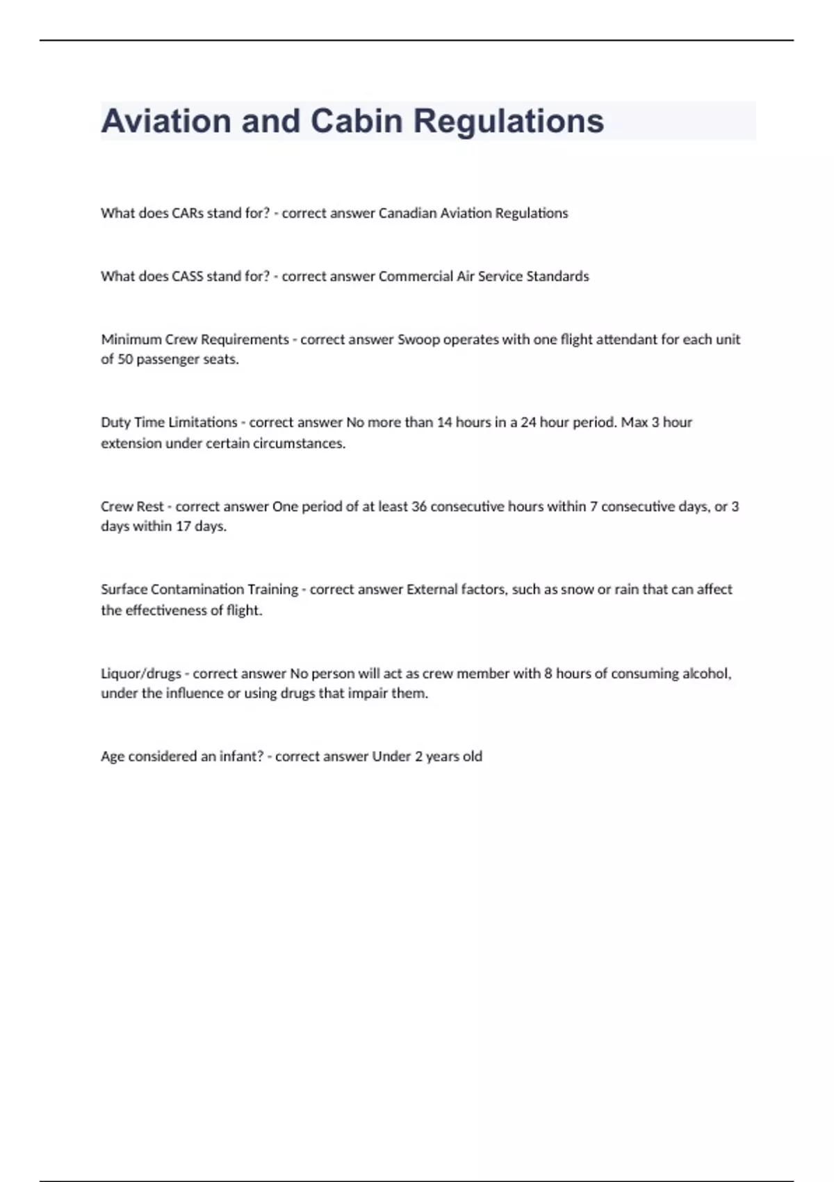 Aviation and Cabin RegulationsWhat does CARs stand for? - correct answer Canadian Aviation Regulations What does CASS stand for? - correct answer Commercial Air Service Standards Minimum Crew Requirements - correct answer Swoop operates with one flight attendant for each unit of 50 passenger seats. Duty Time Limitations - correct answer No more than 14 hours in a 24 hour period. Max 3 hour extension under certain circumstances. Crew Rest - correct answer One period of at least 36 consecutive hours within 7 consecutive days, or 3 days within 17 days. Surface Contamination Training - correct answer External factors, such as snow or rain that can affect the effectiveness of flight. Liquor/drugs - correct answer No person will act as crew member with 8 hours of consuming alcohol, under the influence or using drugs that impair them. Age considered an infant? - correct answer Under 2 years old