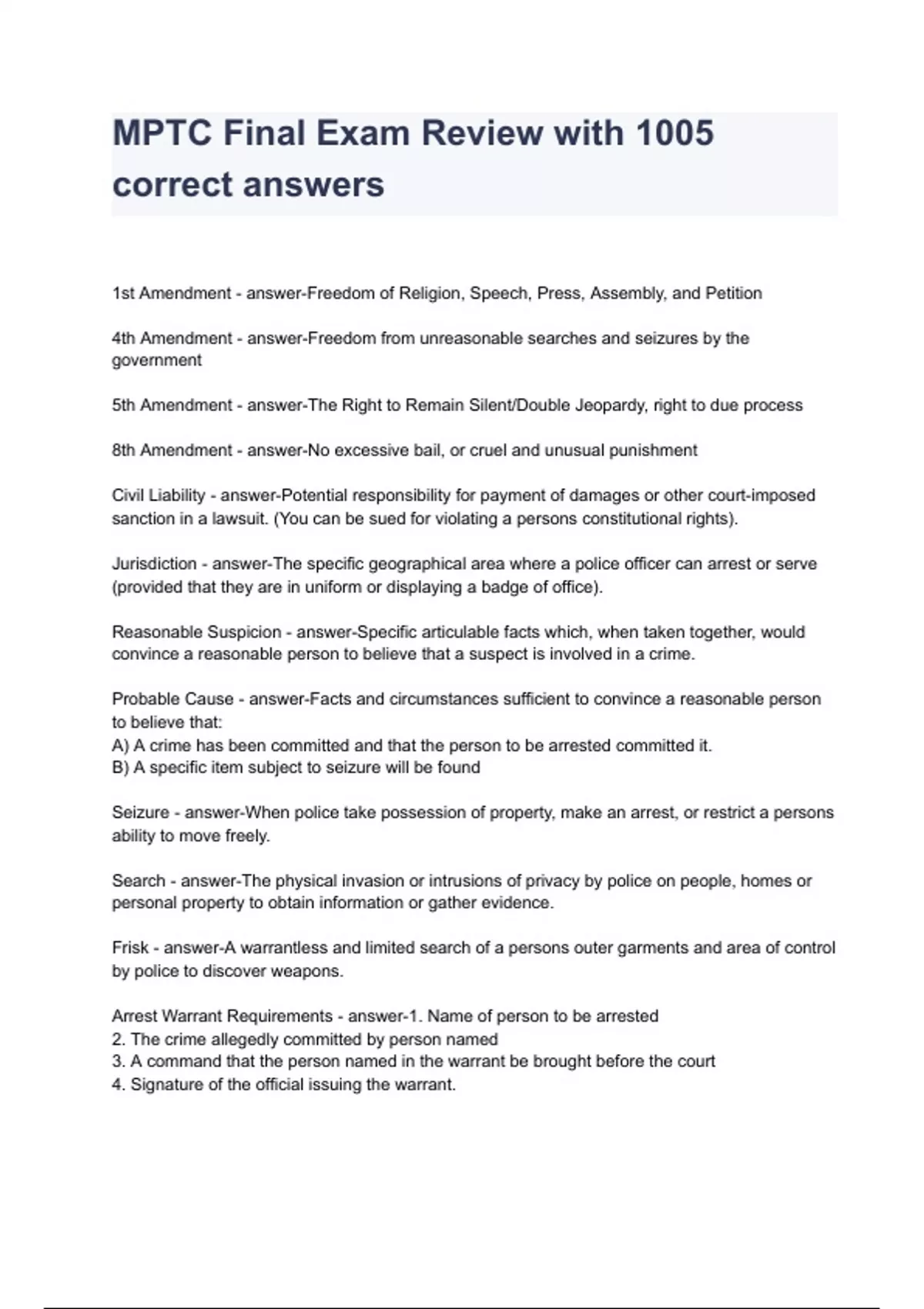 MPTC Final Exam Review with 1005 correct answers
