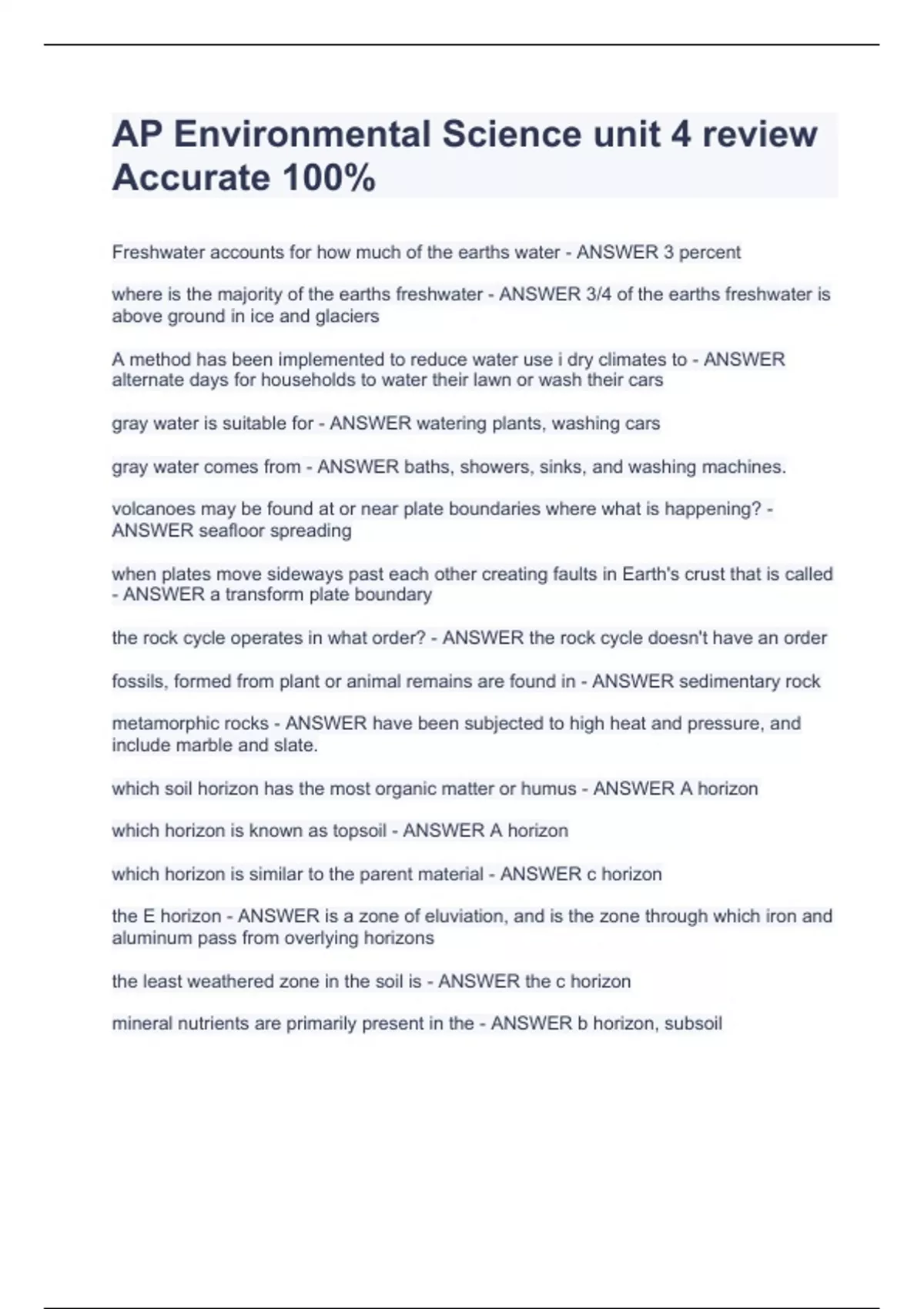 Freshwater accounts for how much of the earths water - ANSWER 3 percent where is the majority of the earths freshwater - ANSWER 3/4 of the earths freshwater is above ground in ice and glaciers A method has been implemented to reduce water use i dry climates to - ANSWER alternate days for households to water their lawn or wash their cars gray water is suitable for - ANSWER watering plants, washing cars gray water comes from - ANSWER baths, showers, sinks, and washing machines. volcanoes may be found at or near plate boundaries where what is happening? - ANSWER seafloor spreading when plates move sideways past each other creating faults in Earth's crust that is called - ANSWER a transform plate boundary the rock cycle operates in what order? - ANSWER the rock cycle doesn't have an order fossils, formed from plant or animal remains are found in - ANSWER sedimentary rock metamorphic rocks - ANSWER have been subjected to high heat and pressure, and include marble and slate. which soil horizon has the most organic matter or humus - ANSWER A horizon which horizon is known as topsoil - ANSWER A horizon which horizon is similar to the parent material - ANSWER c horizon