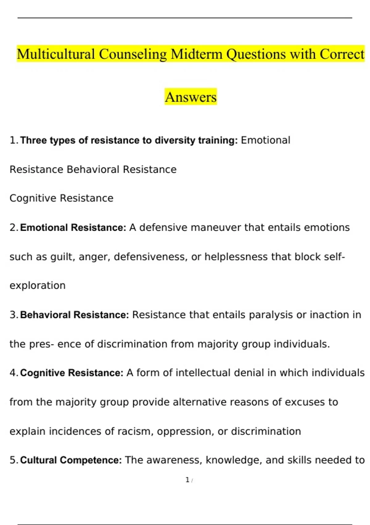 Multicultural Counseling Midterm questions with correct answers