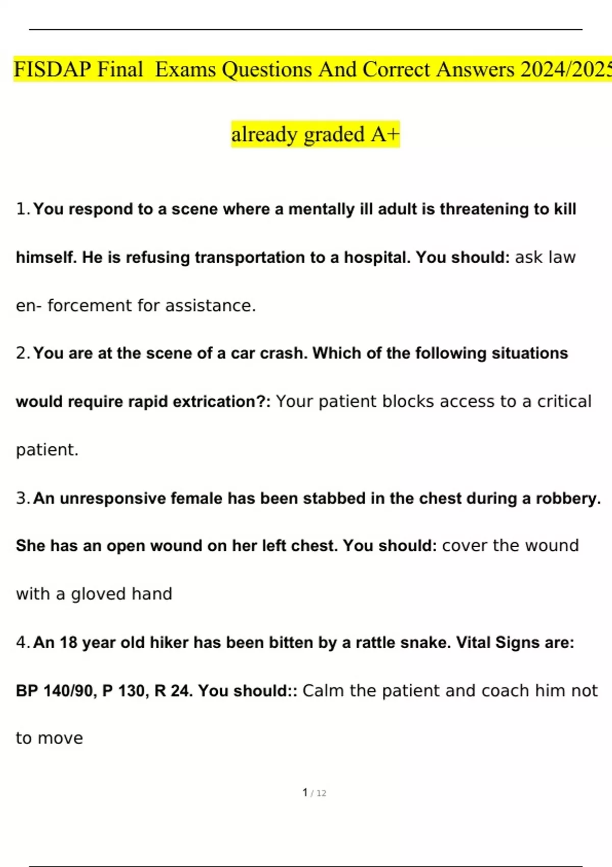 EMT FISDAP EXAMS Bundled Together with complete solutions Questions and Answers 2023(A GRADED 100% VERIFIED)