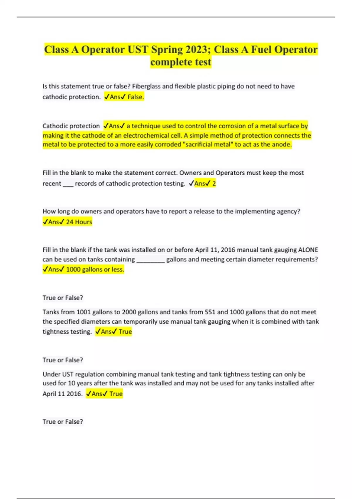 Class A Operator UST Spring 2023; Class A Fuel Operator complete test
