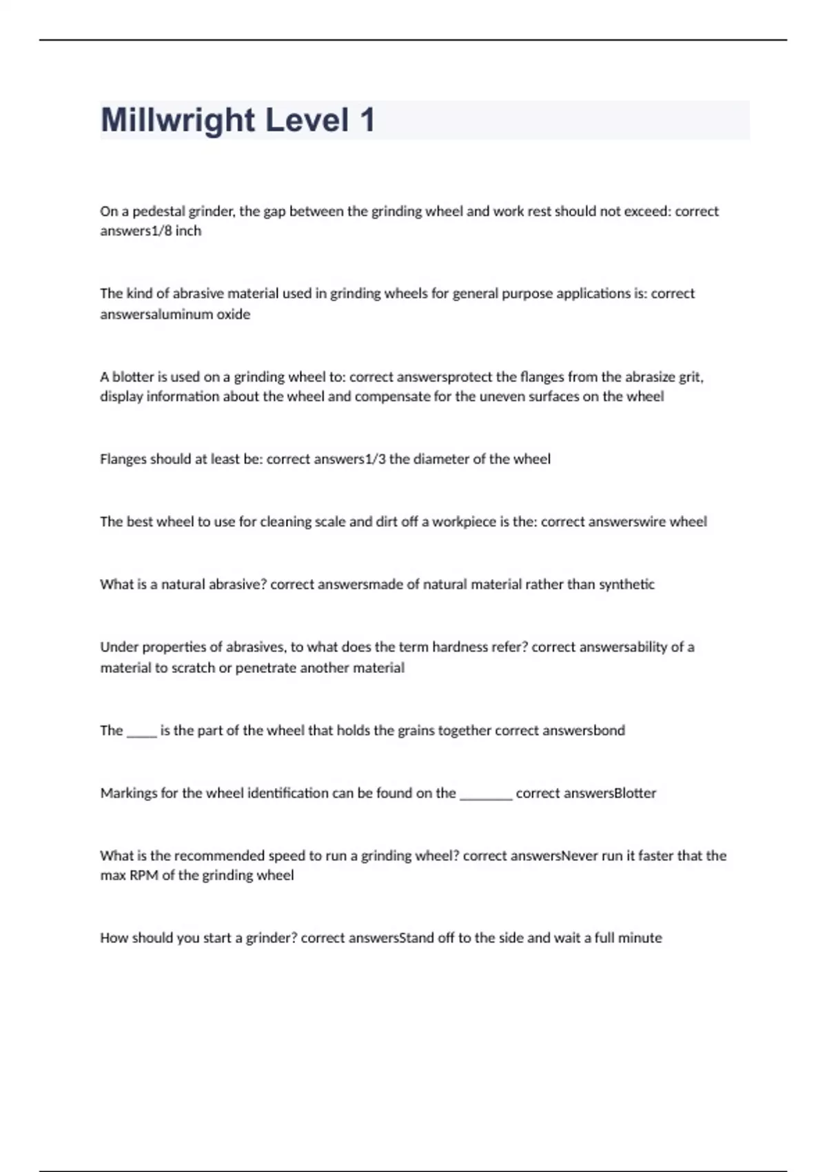 On a pedestal grinder, the gap between the grinding wheel and work rest should not exceed: correct answers1/8 inch The kind of abrasive material used in grinding wheels for general purpose applications is: correct answersaluminum oxide A blotter is used on a grinding wheel to: correct answersprotect the flanges from the abrasize grit, display information about the wheel and compensate for the uneven surfaces on the wheel Flanges should at least be: correct answers1/3 the diameter of the wheel The best wheel to use for cleaning scale and dirt off a workpiece is the: correct answerswire wheel What is a natural abrasive? correct answersmade of natural material rather than synthetic Under properties of abrasives, to what does the term hardness refer? correct answersability of a material to scratch or penetrate another material The ____ is the part of the wheel that holds the grains together correct answersbond Markings for the wheel identification can be found on the _______ correct answersBlotter What is the recommended speed to run a grinding wheel? correct answersNever run it faster that the max RPM of the grinding wheel How should you start a grinder? correct answersStand off to the side and wait a full minute